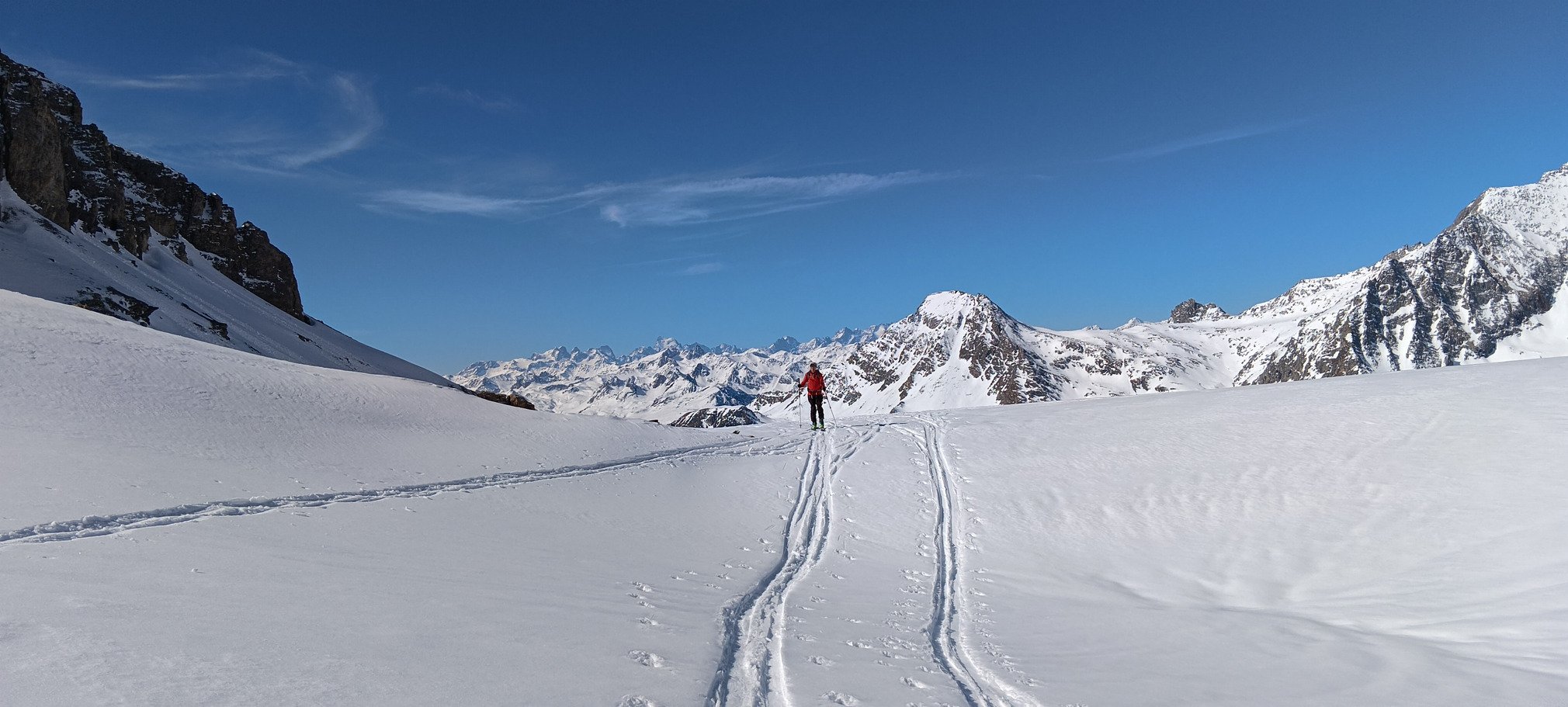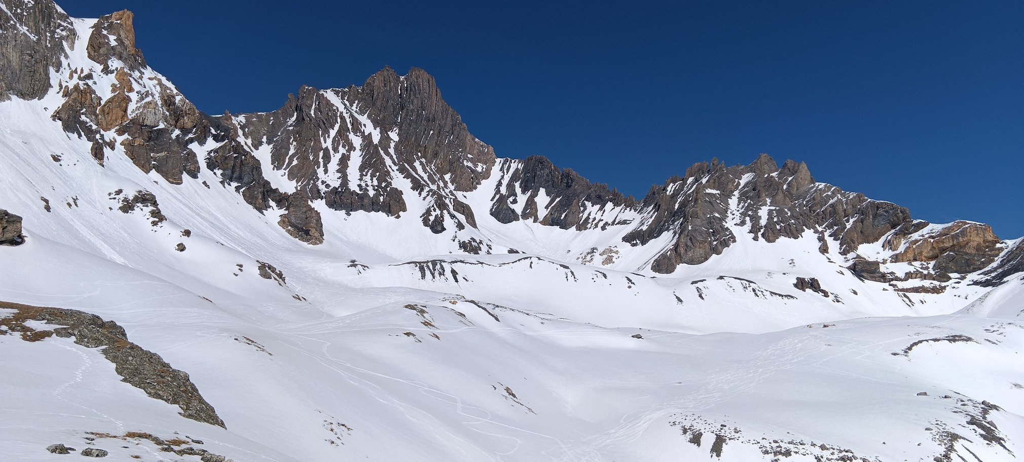 Dans les pentes et vallons qui suivent, il faut viser les endroits qui ont déjà été purgés et/ou skiés, pour se retrouver sur une couche plus lisse et rapide, bien agréable. En revanche, attention aux coups de frein sur les endroits avec plus d'épaisseur. Les parties plutôt plates sont souvent les meilleures (certainement une question d'angle du soleil sur la neige).