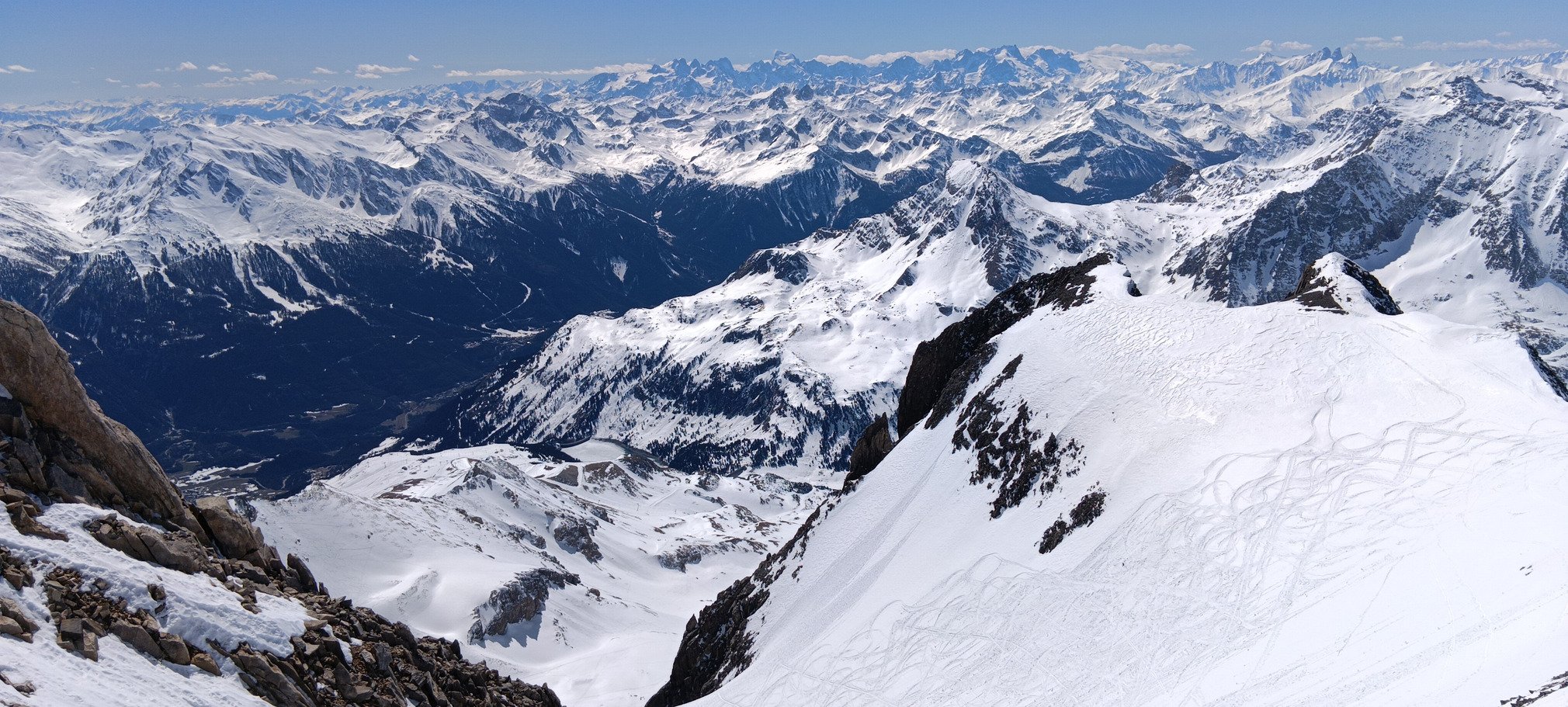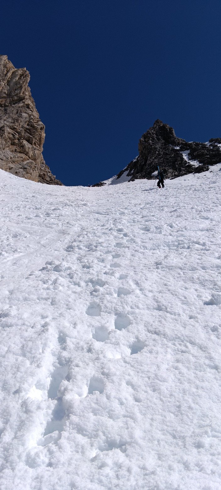 La partie rando sera de toute beauté en termes de paysages. Perso, la montée passe bien, y compris dans le couloir à 40 avant d'atteindre la pente sommitale. Les marches taillées dans la neige sont nickel, et seraient même passées sans crampons dans l'absolu.