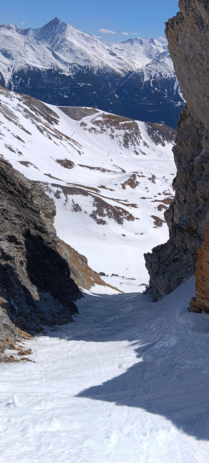 Aux deux tiers de la descente, je repeaute sur une cinquantaine de mètres de dénivelé pour aller chercher le couloir du Grand Chatelard (2817 m d'altitude), qui me faisait baver d'envie à chaque fois que je venais skier à Aussois en alpin. Hormis dans les sections qui restent à l'ombre, la neige n'est pas dingue (très lourde et limite collante), mais ce n'est pas grave, au moins il est coché !