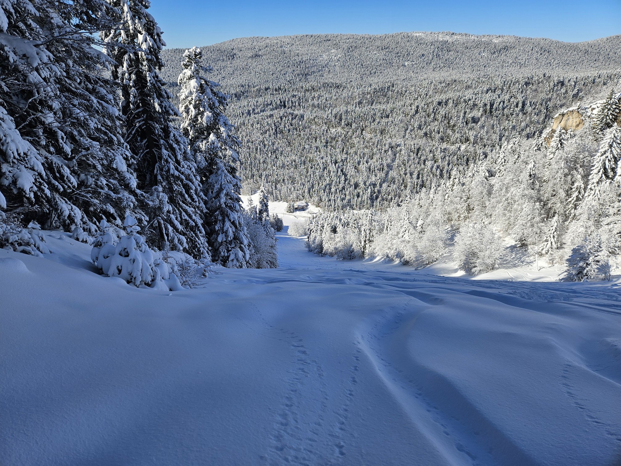 Quel parcours ! D'abord, suivre un (interminable) faux plat depuis le haut du domaine. C'est une piste de ski de fonds, mais aujourd'hui elle n'est pas damée ; je brasse (beaucoup) de neige avant d'arriver en haut du téléski à l'abandon.