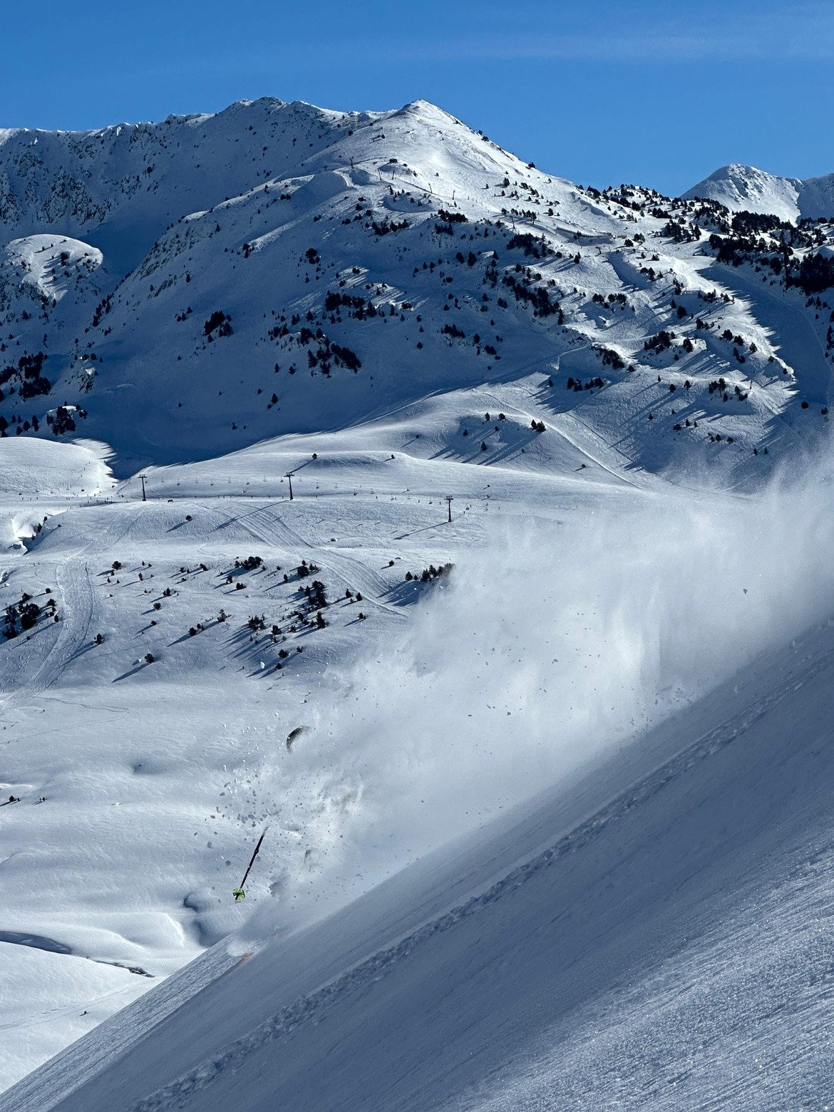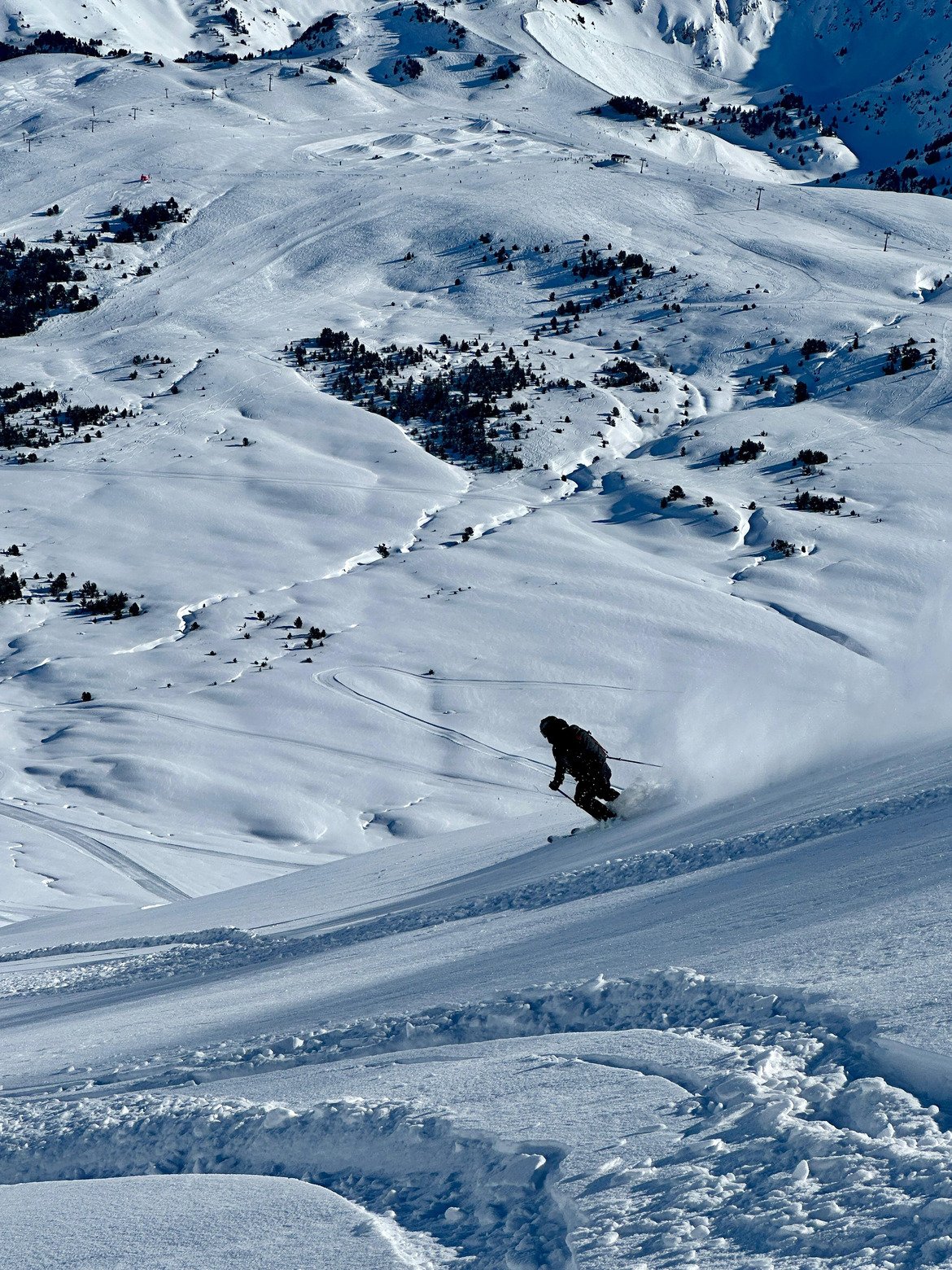 En partant dans une face de pente douce, je tombe sur 2 joyeux lurons en train de bricoler leur drone dans une face. Aussitôt, j'interpelle en espagnol puis en français (nos deux compères sont des catalans qui rident vers les PO). Je propose de rider ensemble, et très vite la confiance est là, on part pour la journée !
