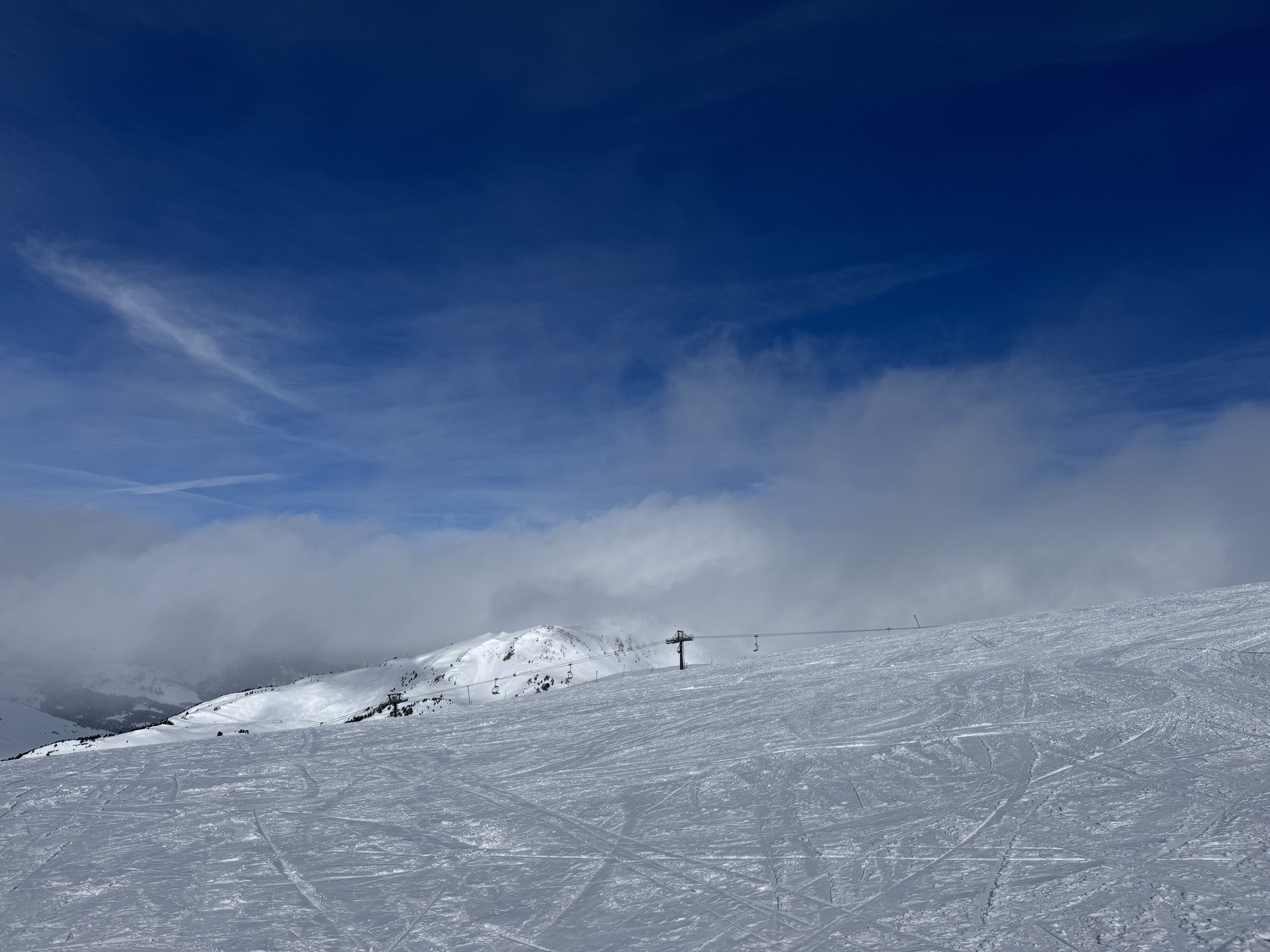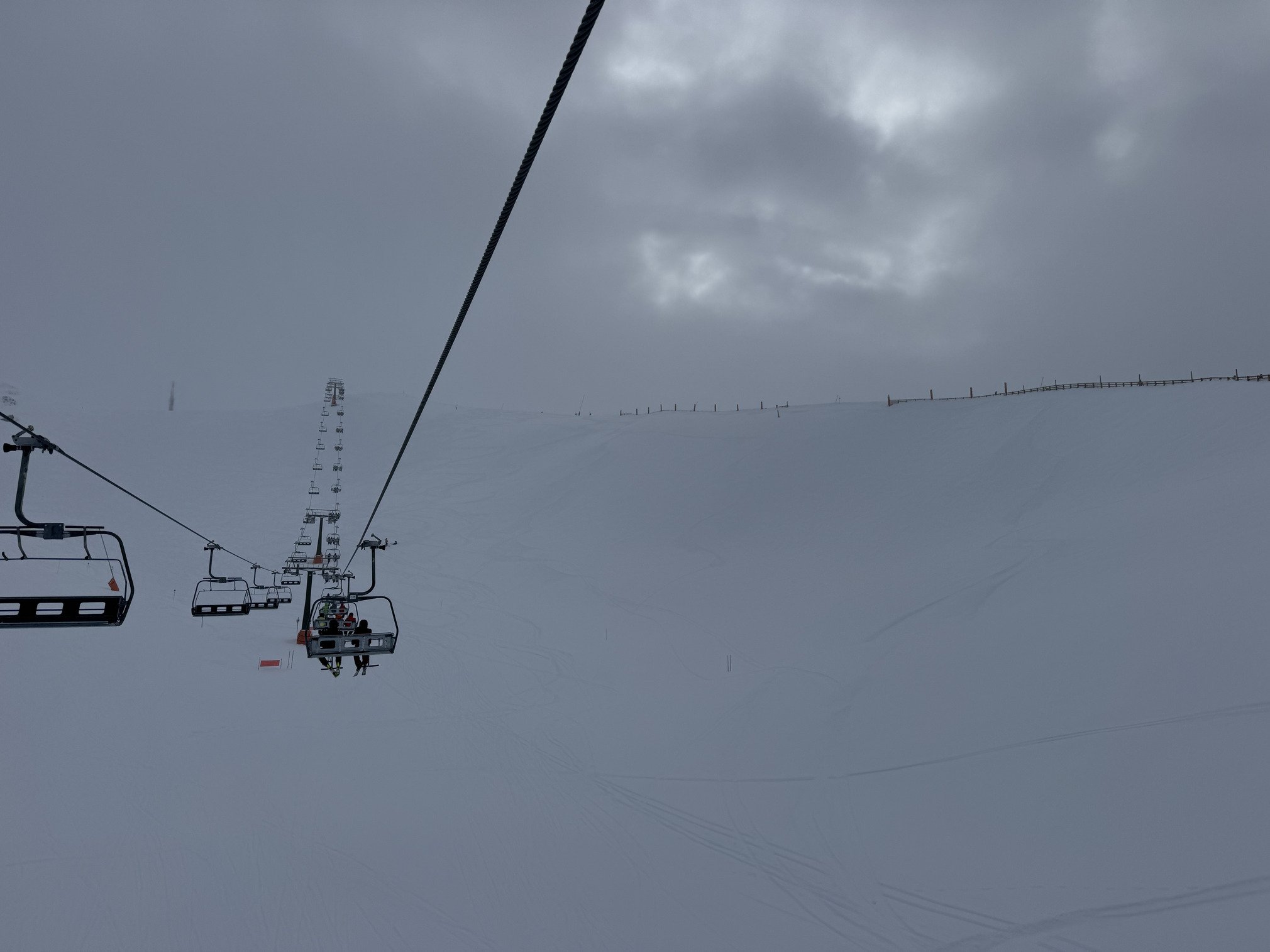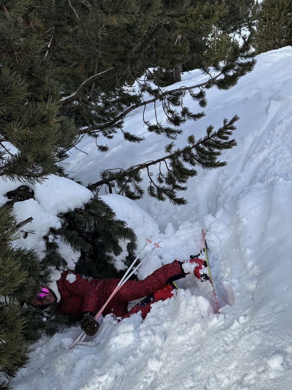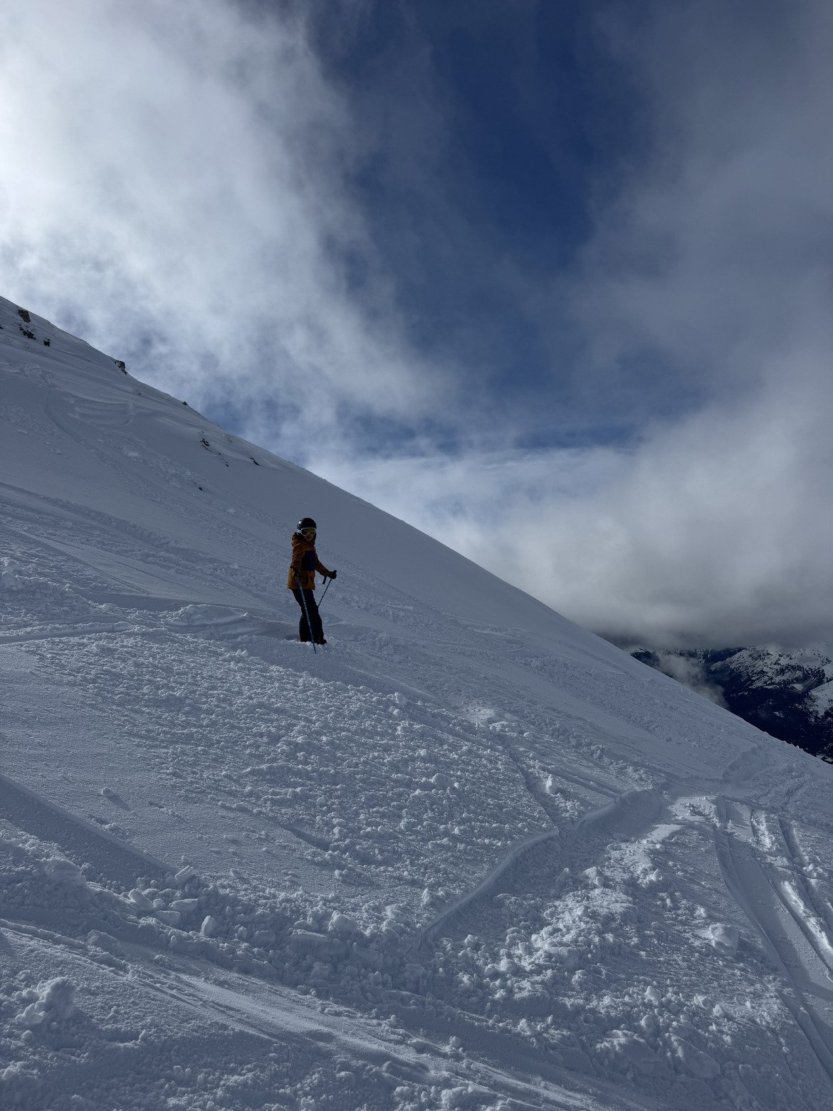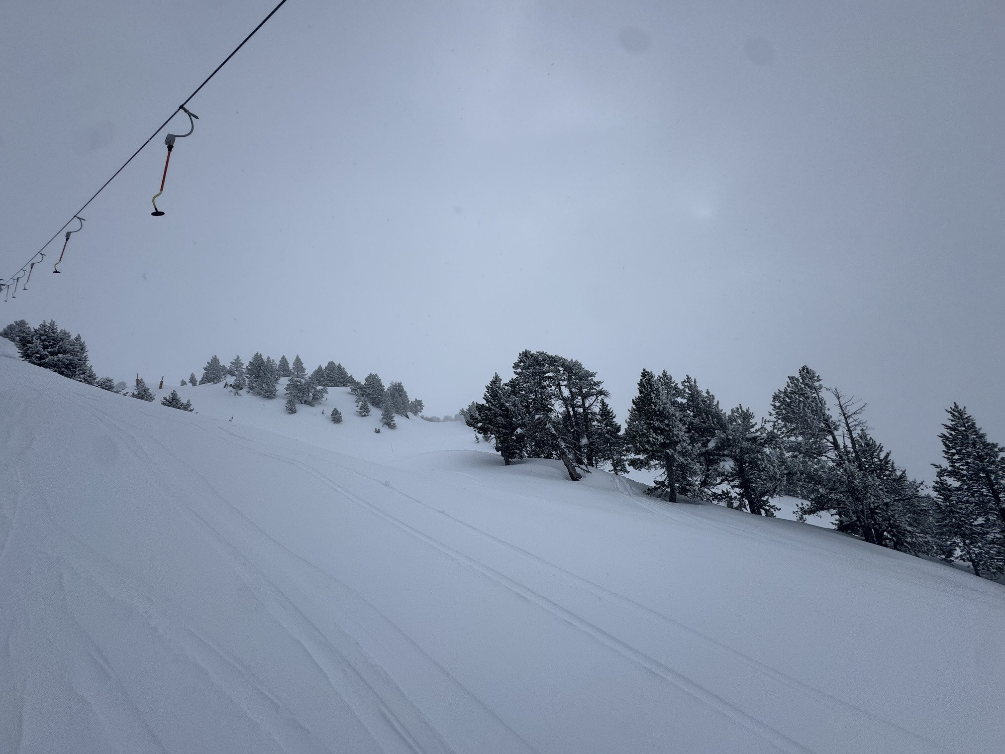 Réveil sous les conifères blanchis, ciel chargé… je dépose les enfants au cours de ski pour 3heures ce matin et récupère ma team 1 habituelle sans prétention…sauf qu’il a bien neigé et que tout est bon là haut…