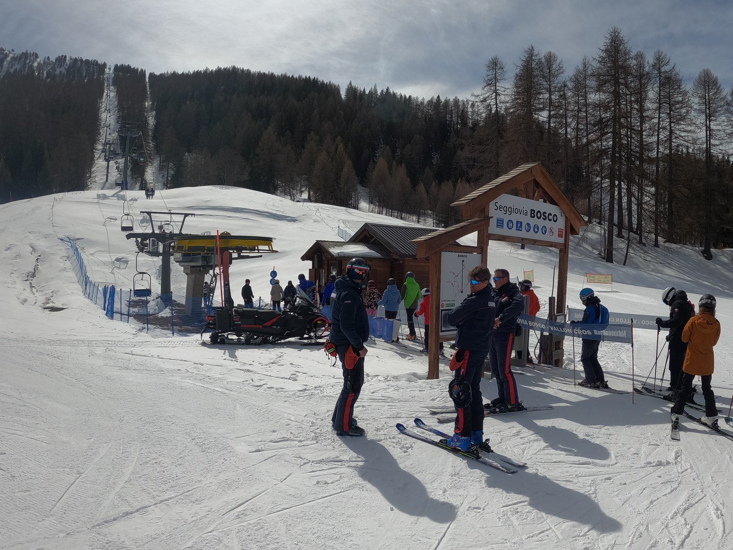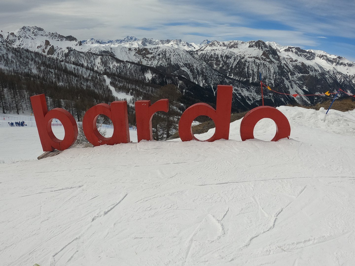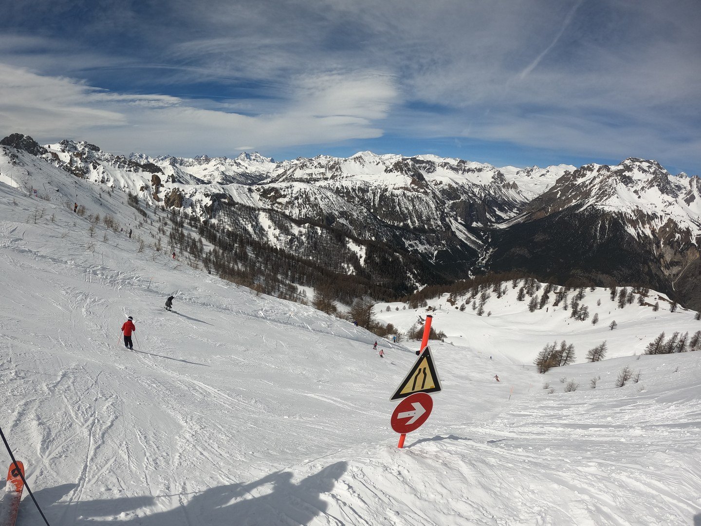 A 9h30, la neige est dure ... et elle le restera toute la journée, rendant le hors piste impossible. Et les Carabinieri viellent : ils sont quasiment partout (mais très sympa) à la recherche du contrevenant sans casque, maintenant obligatoire en Italie. Peut-être surveillaient-ils aussi les hors piste (de toute façon, impossible), je pensais que l'ARVA était maintenant obligatoire ; de ce que m'a dit un des gars de l'USCA, c'est juste passer au-delà des marquages "attention avalanche" qui l'est !
