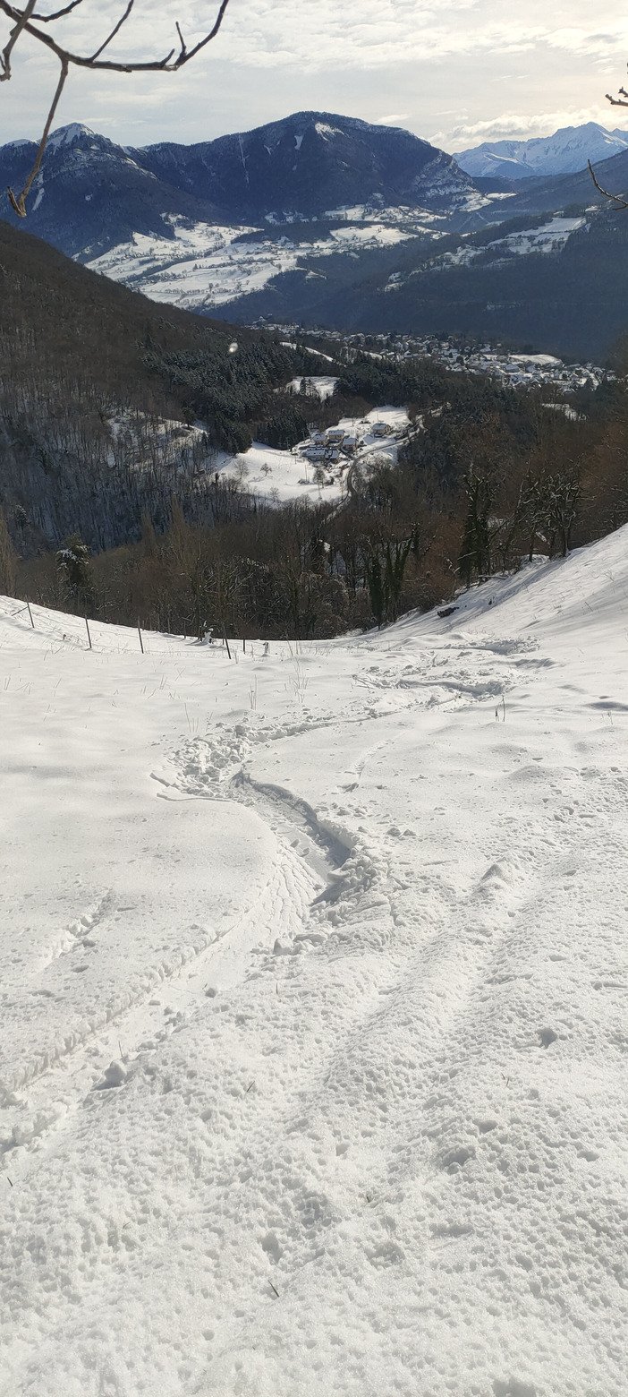 2) Les prés qui suivent (environ 300 m de dénivelé) sont dans une poudre qui devient presque collante. Il n'y a pas de sous couche, l'herbe se dévoile après chaque virage ou presque (photo 1), mais avec quasi 40 cm, aucune touchette. Ça reste correct à skier car il n'y avait que 2 ou 3 traces hormis la mienne.