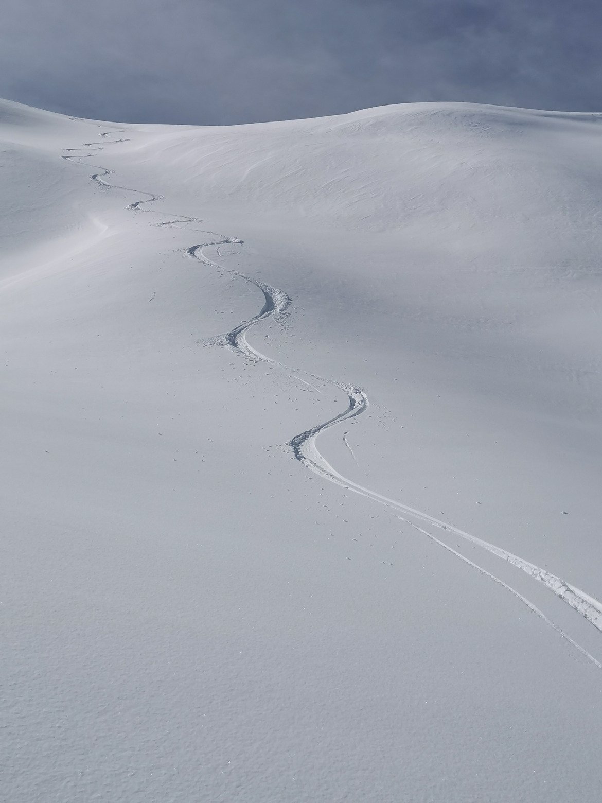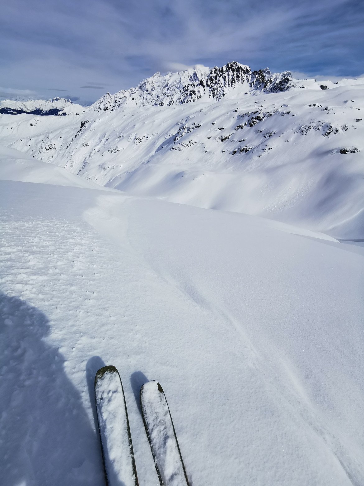 Les 400 premiers metres sont vraiment bons. La poudre a un peu chauffé mais reste bien conservée. Un régal. La suite est un peu moins bien et il faut jouer avec les orientations. Ce qui est resté à l'ombre est limité inskiable et au soleil c'est... lourd. Bref, la fin de l'itinéraire offre un bon potentiel mais ça sera pour une autre fois.
