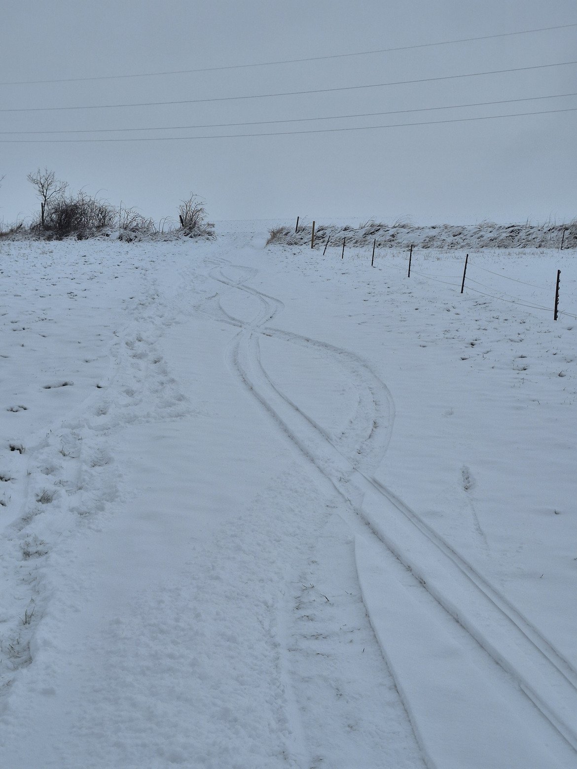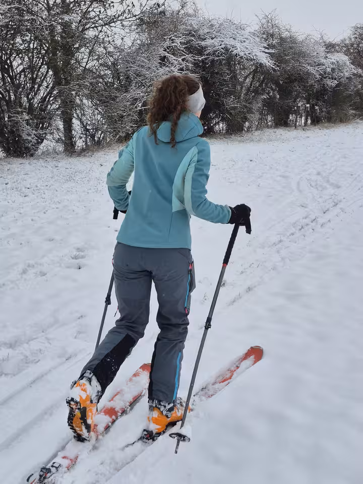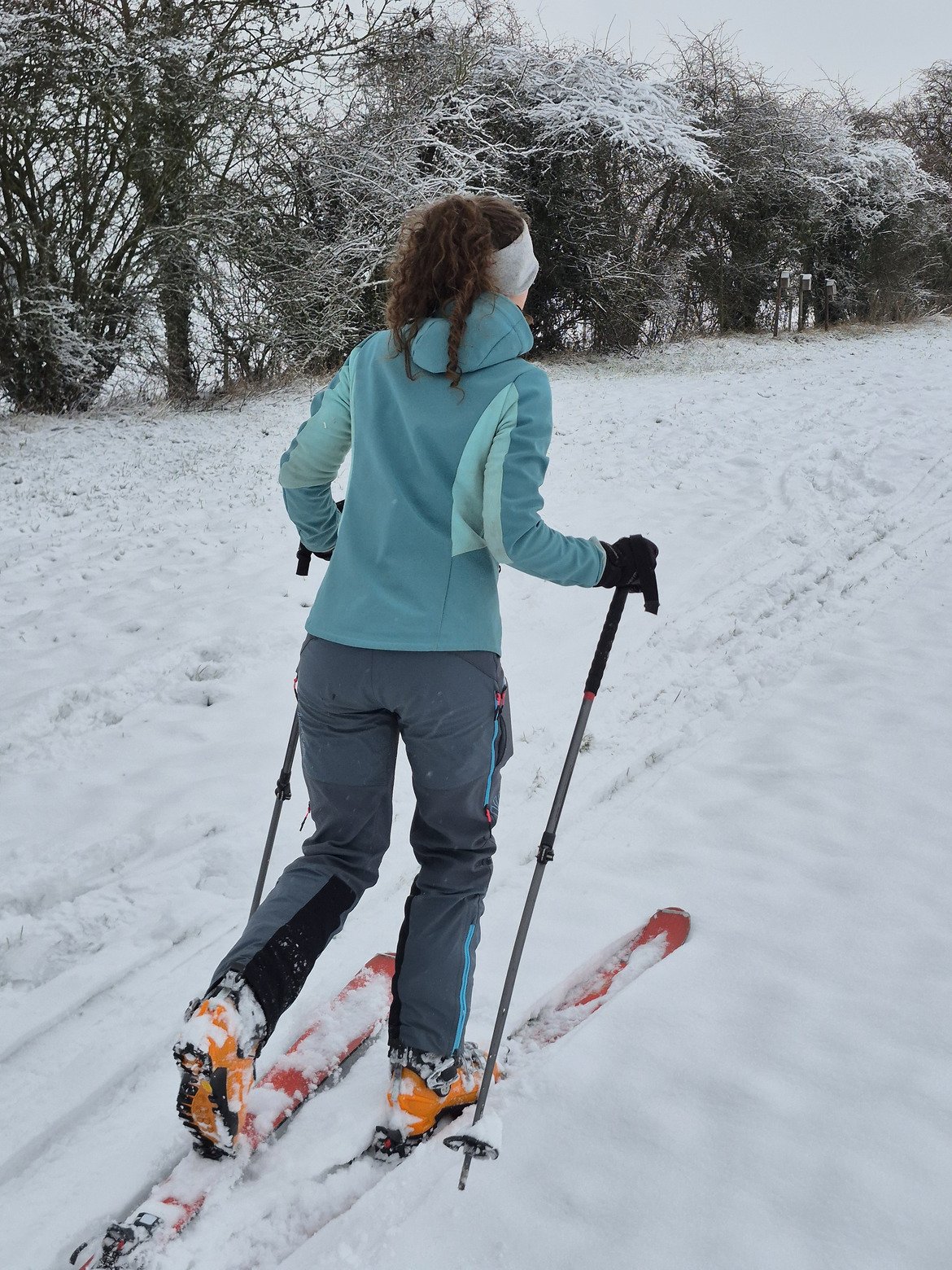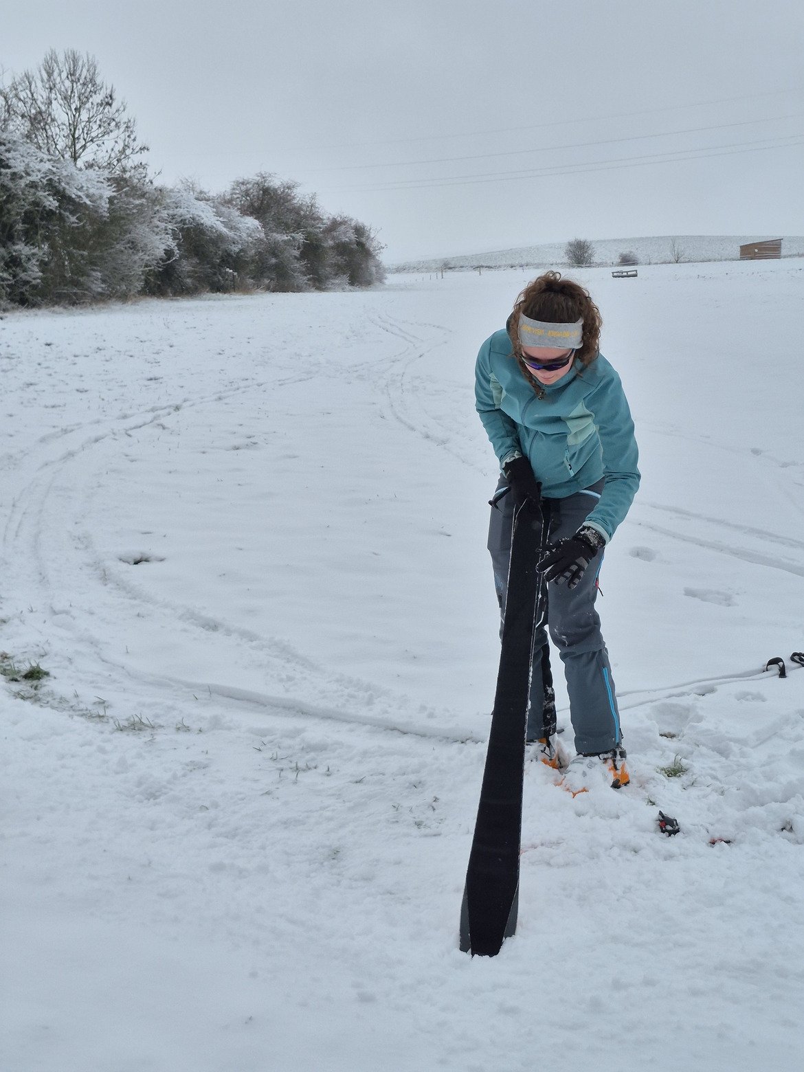 Donc cet après-midi, session ski de rando, on chausse devant la maison 🤩 et direction la côte un peu plus loin pour des up&down. L'herbe n’est pas loin mais la glisse est bonne et pas un cailloux sur cette pente (gentille... 10%) donc on se fait plaisir.