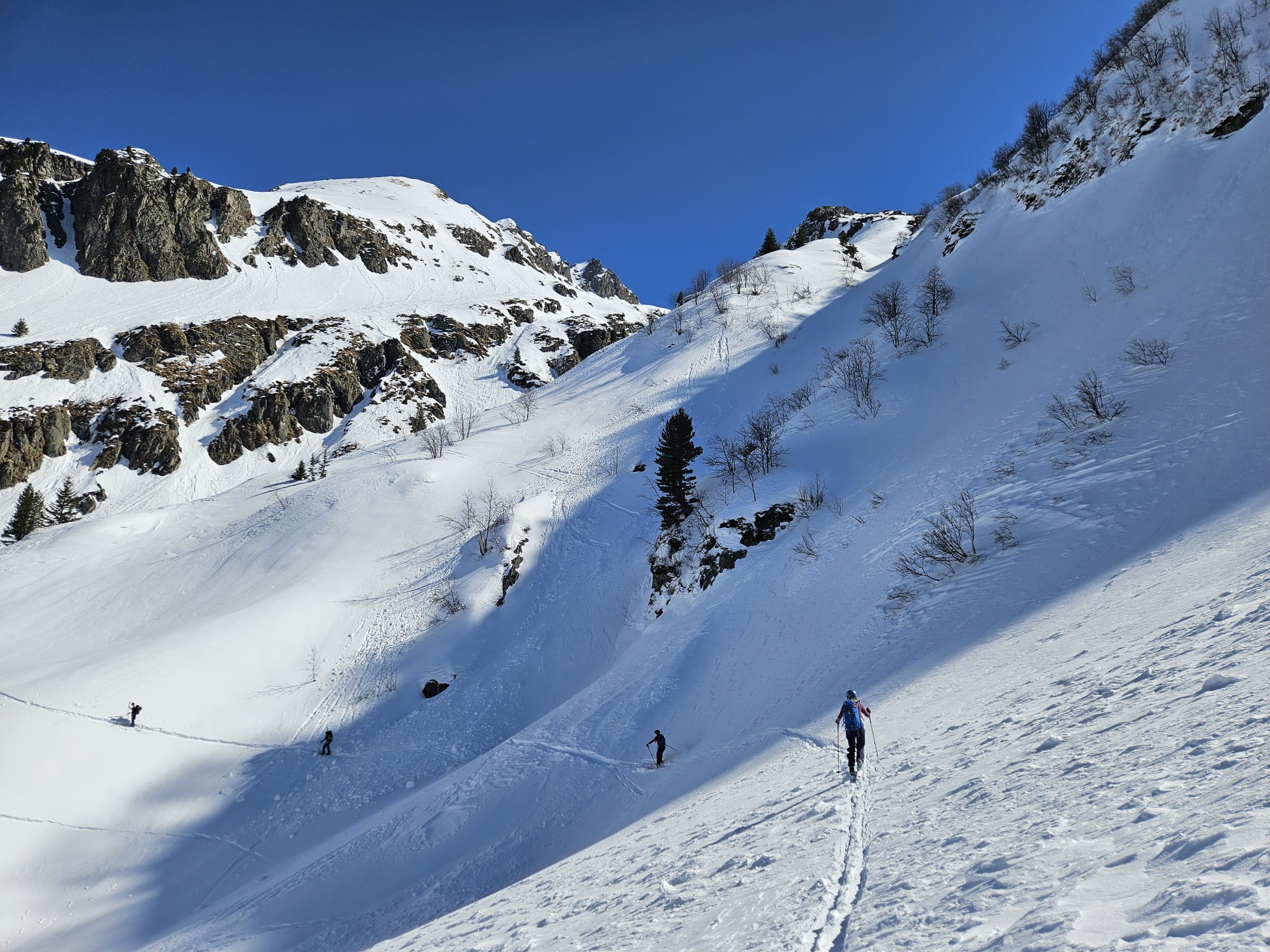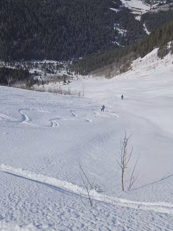 Mais ! Mais ! On a trouvé nos patchs de poudreuse. Une poudreuse de mort de faim ; 4 ou 5 virages par ci, 2 virages par là, au petit bonheur la chance dans les petits valons.