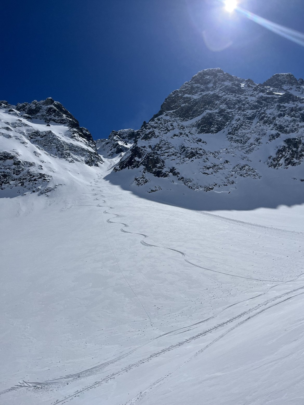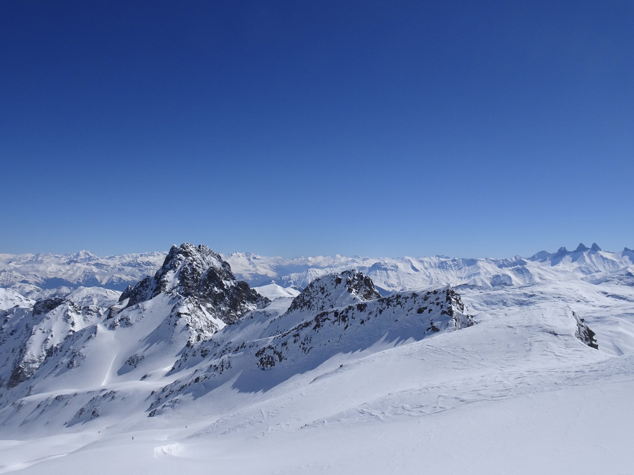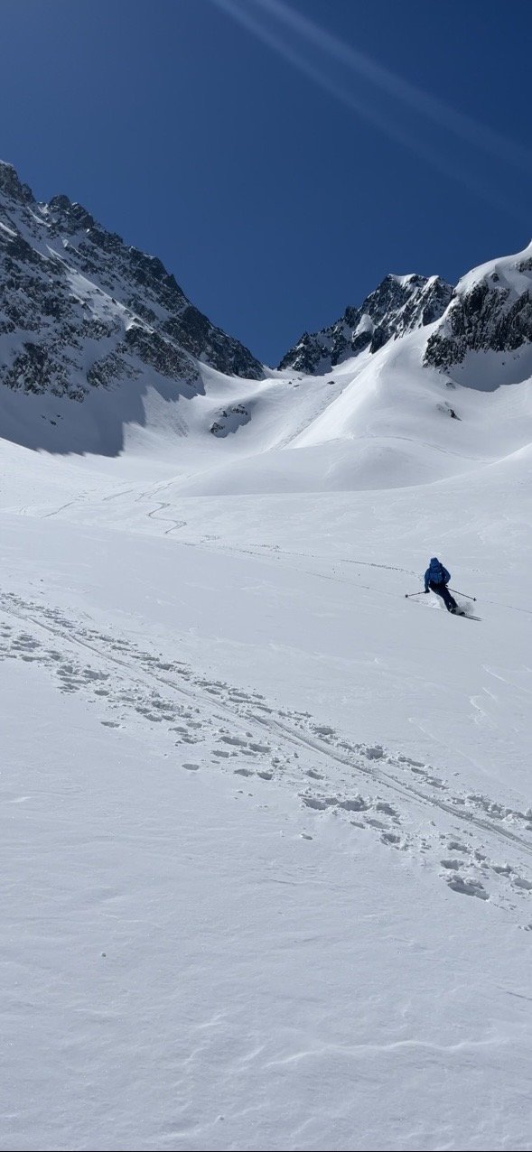 Poudre de 2000 à 3000m sur les pentes nord, nord est. Et pas encore trop transformée dans les sud sud est. Ça va pas durer au vu des températures en redescendant à 1000m.