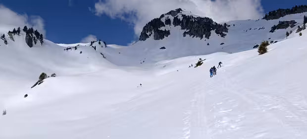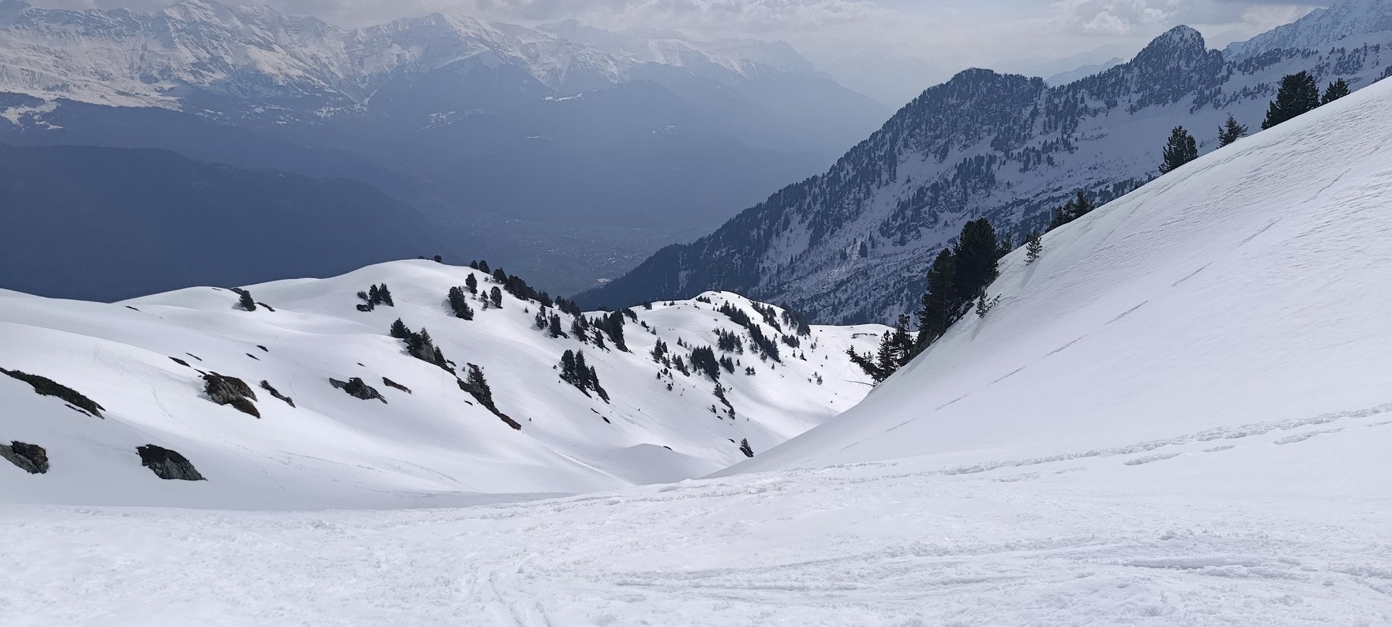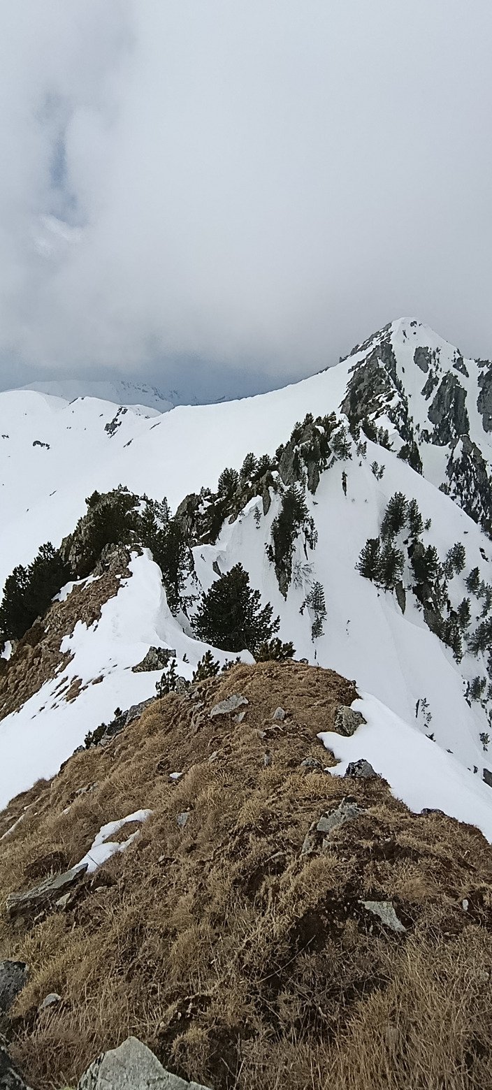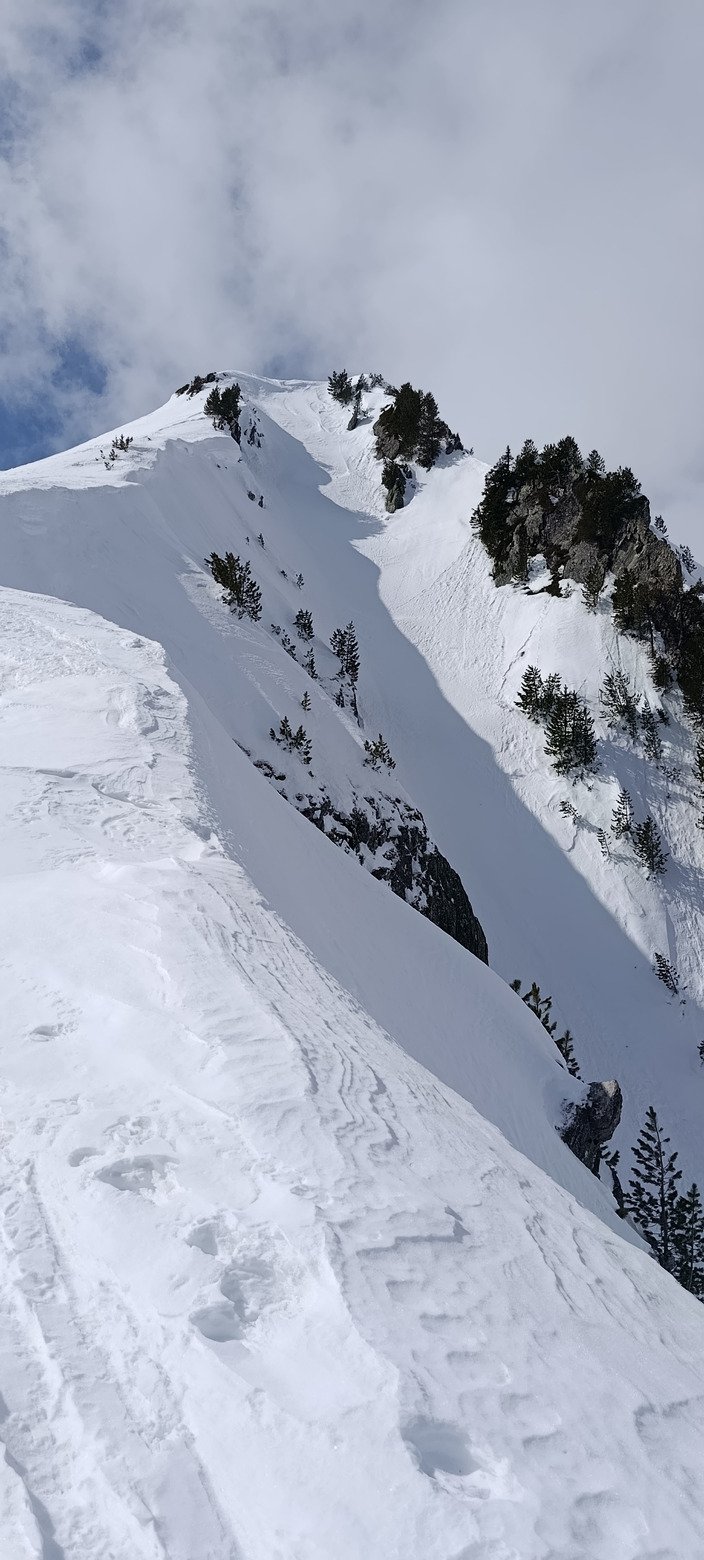 C'est un lieu qui se mérite. La route forestière qui y emmène est déjà une aventure a elle toute seul. Tu ne sais pas si elle ne sera pas barrée par un arbre, un rocher, une avalanche... Ni a quelle altitude tu vas devoir te garer. C'est donc 200m sous les Varvats que nous démarrons. Après un petit portage de 300m de déniv dans la forêt, nous chaussons sur la route des Etaves. Le regel n'est pas top, la température est plus douce a 1400 qu'à Lyon. Nous montons sereinement jusqu' au chalet d'Arpingon en passant juste sous la croix éponyme. La suite se passe dans le vallon juste au dessus du chalet. Les convertions s'enchaînent jusqu' à la crête qui donne sur le vallon de la Frèche. Avec vu sur un magnifique couloir exposé Nord. Les derniers mètres sont un peu plus raide et on déchausse et dépeaute 20m sous le sommet que nous rejoignons à pieds. Depuis notre départ, nous sommes seuls au monde. La vue est magnifique et embrase les 2 vallon du grand Miceau, aux grands Moulins et de l'autre côté de la vallée avec le cheval noir et la chaîne de la Lauzière.