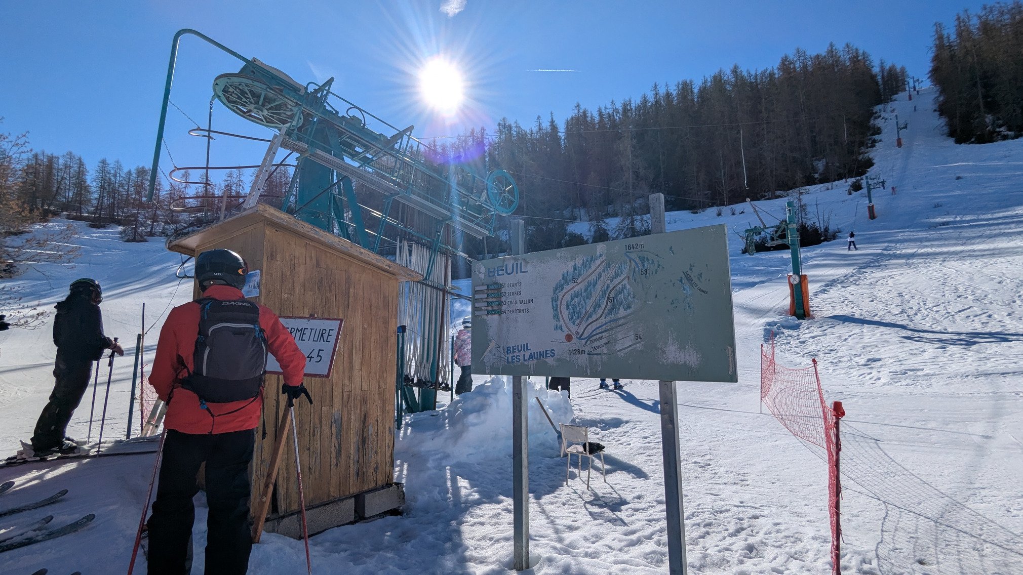 C'est des très vieux téléskis, des vieux panneaux de direction en bois. Des montées et des descentes assez courtes mais c'est tellement beau et tellement à l'écart du reste. on prend le fil neige de liaison des Eguilles et d'un coup on est presque seul au monde. Le Tk de St Jean nous ouvre la porte de ce super domaine de Beuil presque caché.
