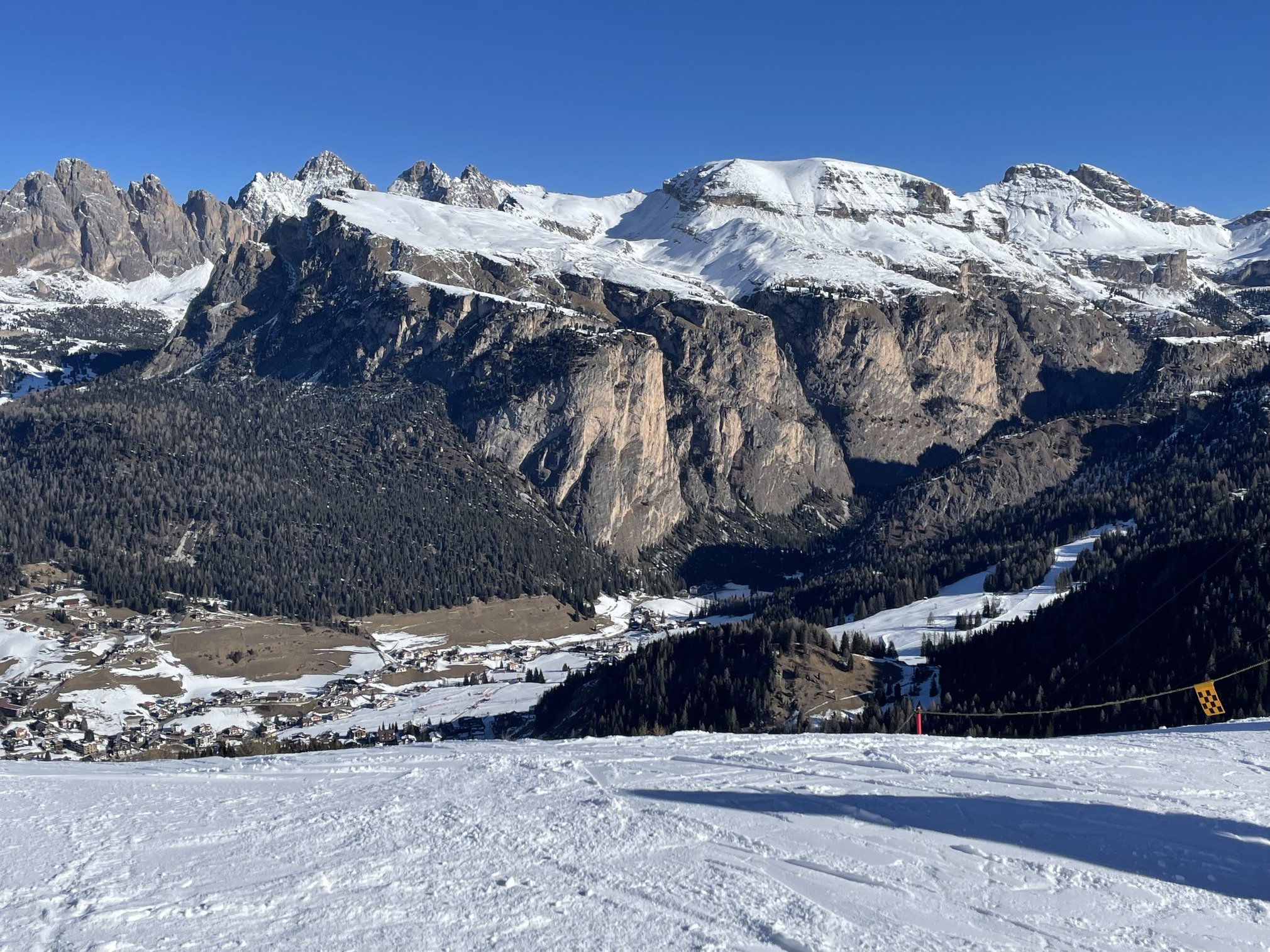 Beaucoup de monde sur les pistes de liaison de la Sella Ronda.En général les gens skient vite sans forcément un top niveau et surtout vous collent, passent très près! Je n’ai jamais vu autant d’accidents en si peu de temps (5 en moins de 2h!), ce qui m’a semblé être des télescopages alors qu’il n’y avait pas de croisement…