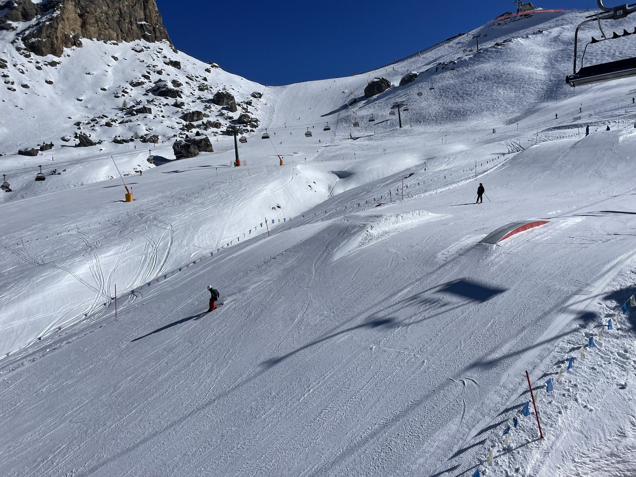 Le matin, neige convenable pour la température, mais dans l’après-midi, ça alterne entre neige très très dure, et neige lourde selon les expositions, les bosses et des plaque de verglas selon l’exposition commencent à apparaître. Pas de caillou ni herbe sur les pistes. Funpark sympa.