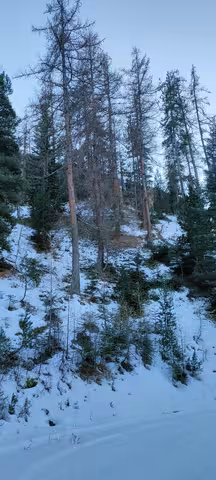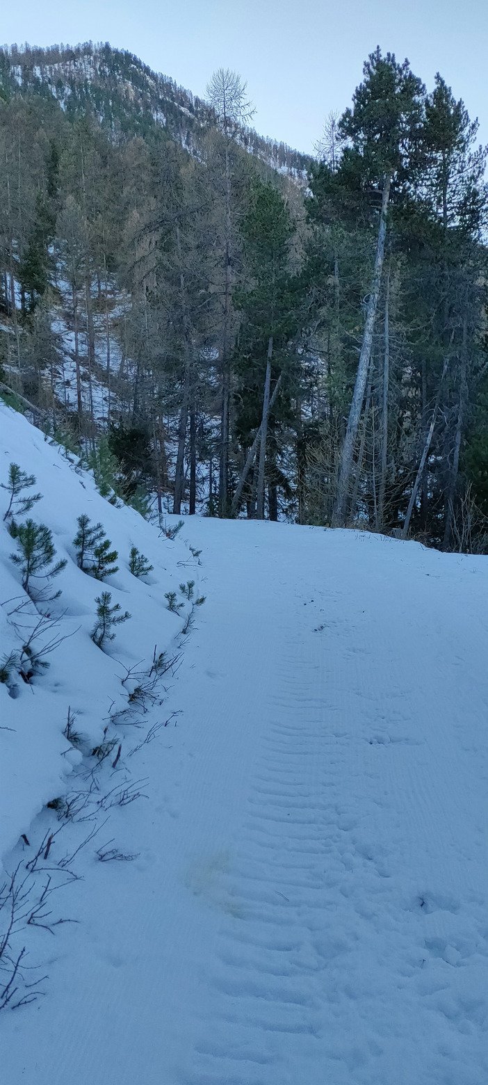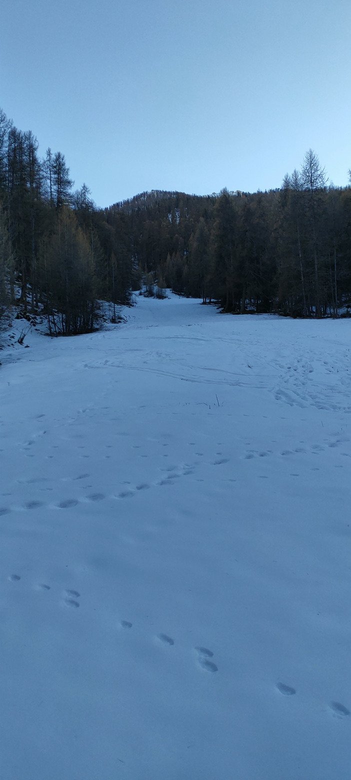 Arrivé au sommet du téléski, je bifurque sur le chemin à droite (une piste de ski de fond qui a été damée il y a quelques jours apparemment, mais qui est fermée aujourd'hui), en espérant que sur un vallon plus lointain, l'enneigement sera meilleur (oui, parfois, mon côté optimiste me pousse à faire l'autruche 😜). Évidemment ce n'est pas le cas, et cinq minutes plus tard, je signe le but de cette rando.