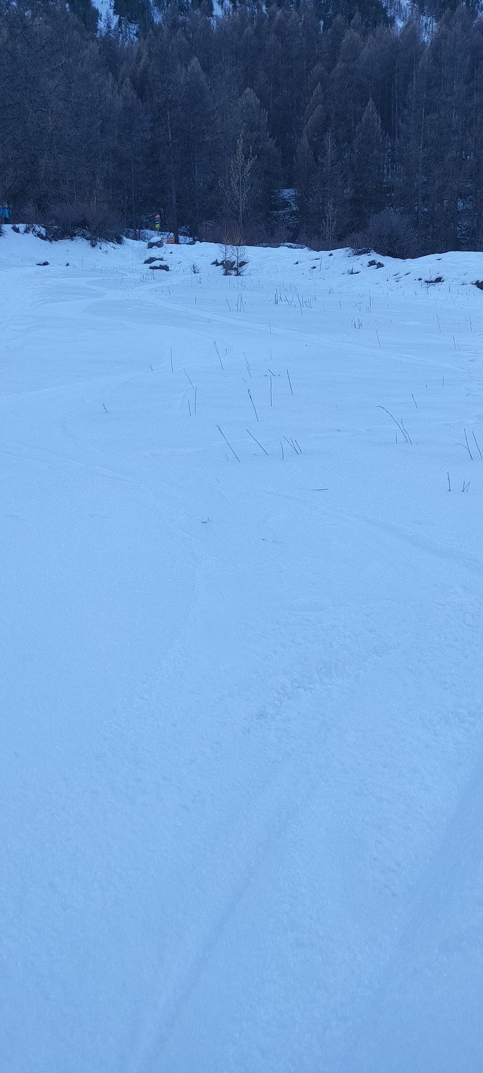 Vu la purge annoncée sur la piste du téléski, je préfère continuer un peu la piste de fond et redescendre mon dénivelé homérique (un bon tiers d'une montée de Tour Eiffel, tout de même 😂) par les champs en terrasses. Finalement ce n'est pas si pire, car au moins il n'y a pas de vieilles traces regelées. C'est lisse avec même une sorte de petit givré en surface, ce qui me permet de claquer 4 bons virages ! On se console comme on peut...