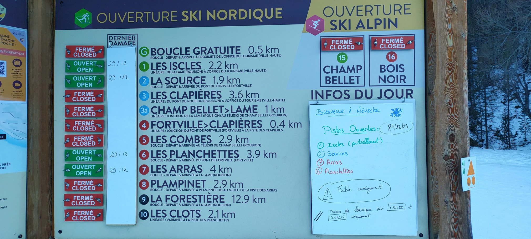 Pour info, le ski de fond est partiellement ouvert (voir dernière photo avec le panneau d'ouverture). Le plateau de l'Echelle a aussi été "pré damé", avec possibilité de se garer vers la petite église environ 1 km sous le col (si vous avez des pneus neige), d'après le personnel d'accueil du domaine nordique.