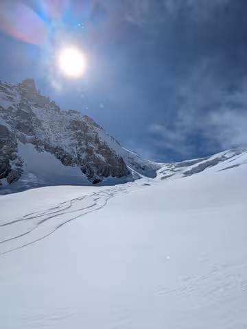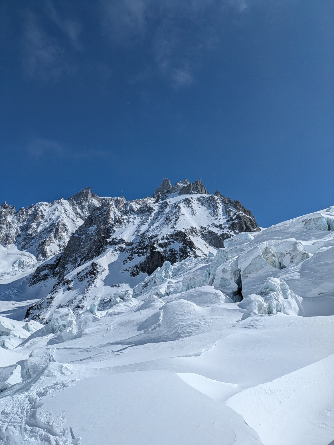 Qu'à cela ne tienne, direction l'aiguille du midi ! J'arrive à 12h30, pas d'attente, peu de monde dans la benne et personne sur l'arête. On trace en vitesse, il reste de quoi se faire bien plaisir et certaines variantes de la vallée Blanche n'ont pas trop été affectées par le vent. Un bon 50 facile je dirais.