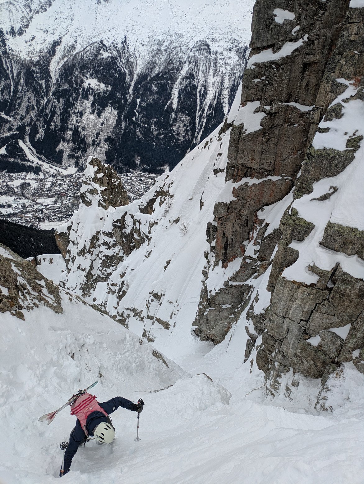 Puis descente dans le couloir de l'ENSA qui me fait de l'oeil depuis des années. Un beau moment et surtout une belle ambiance dans le couloir. La neige était ferme et bien portante, parfait comme conditions pour du raide. En revanche le couloir n'est pas assez chargé sur le haut, nous avons dû descendre en crampons et un piolet ne serait franchement pas de trop.