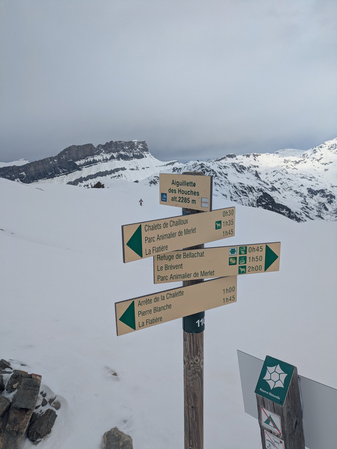 Pour commencer une petite ballade à l'aiguillette des houches où l'on trouvera de la bonne neige mais une visibilité perfectible en ces temps de foehn. Au moins on est tout seuls !