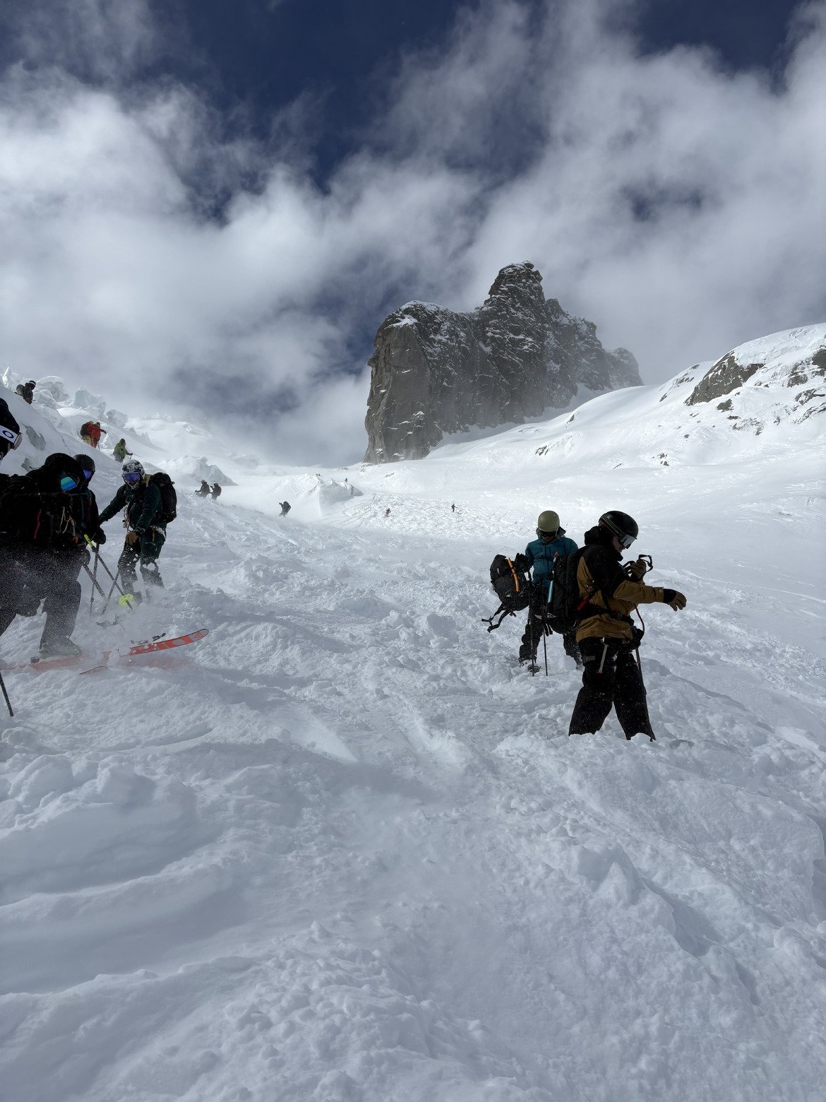 On pensait partir sur un Moyen Envers, mais les énormes accumulations et une visibilité moyenne nous ont un peu refroidis. On décide donc de partir vers le Gros Rognon. La traversée est infâme : on se relaie à une petite dizaine pour faire la trace, et c’est très très physique.