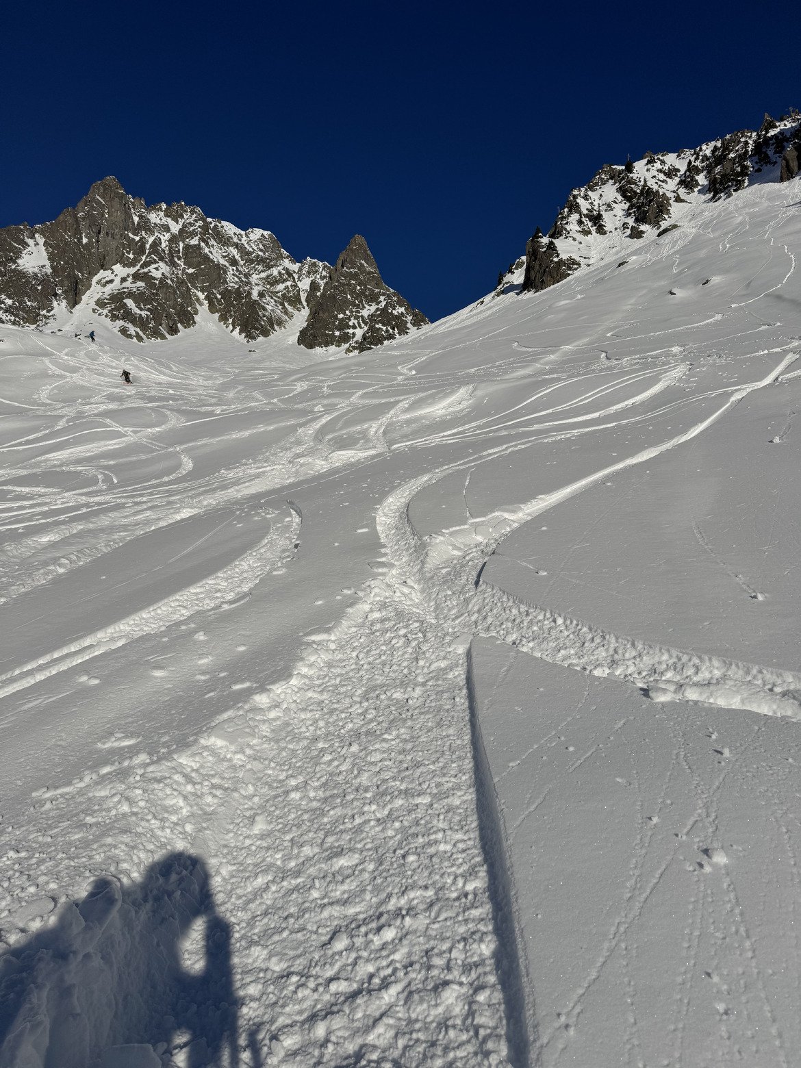Premier run dans la combe lachenal avec une petite croûte de surface. Le deuxième côté floria avec twan, meilleure neige avec la petite croûte déjà réchauffée mais encore pas mal de cailloux. Puis on a enchaîné les run dans lachenal avec une bonne neige dans les pentes du fond et de plus en plus alourdi de partout. Il faisait bien chaud !!
