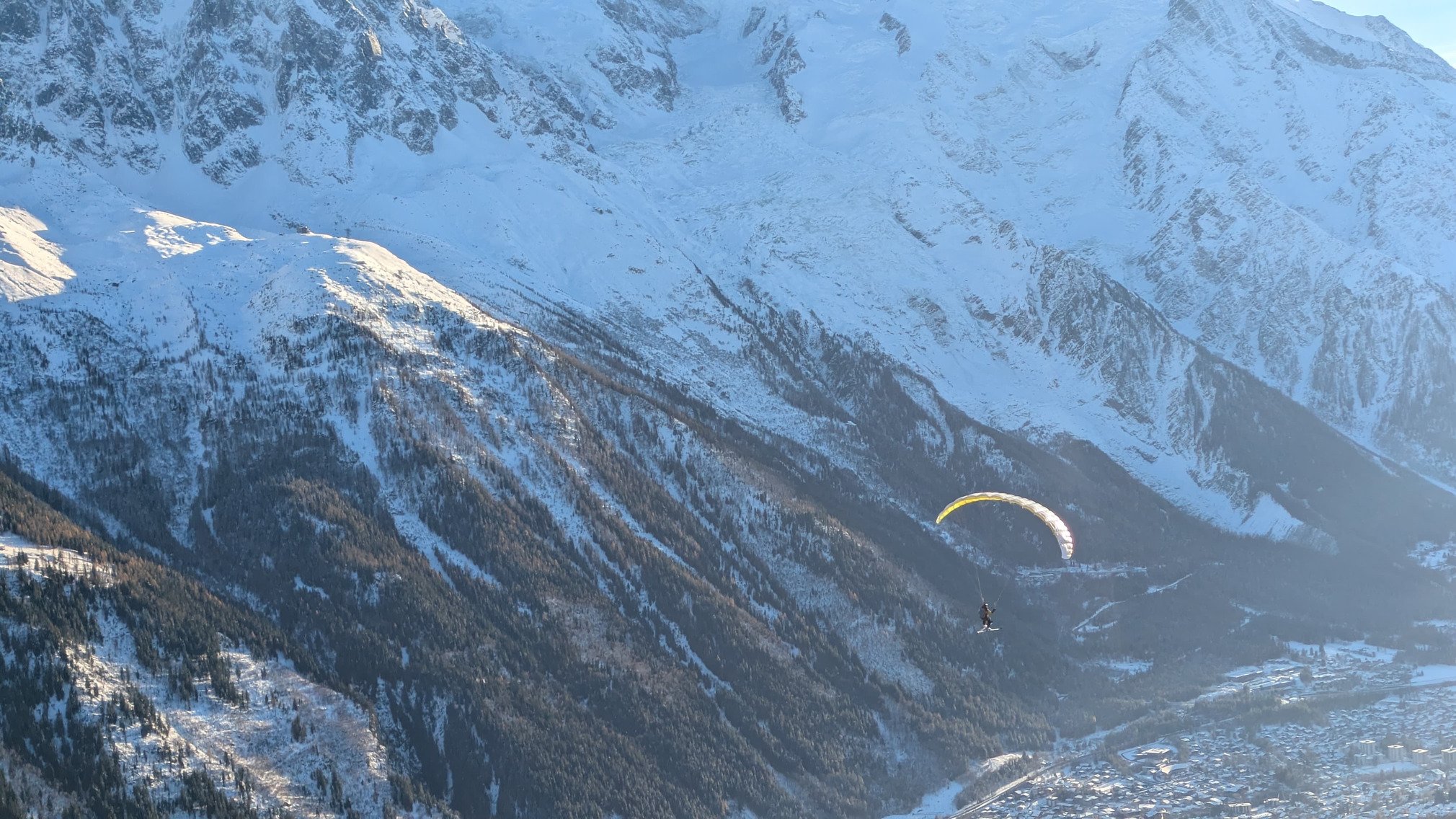 La reprise est physique et la météo revenue au grand ciel bleu après un passage bien couvert. Ce sera parapente pour l’après midi, mes premiers vols à ski ! Magnifique avec la vue sur les aiguilles de Cham et le mont-blanc 😍