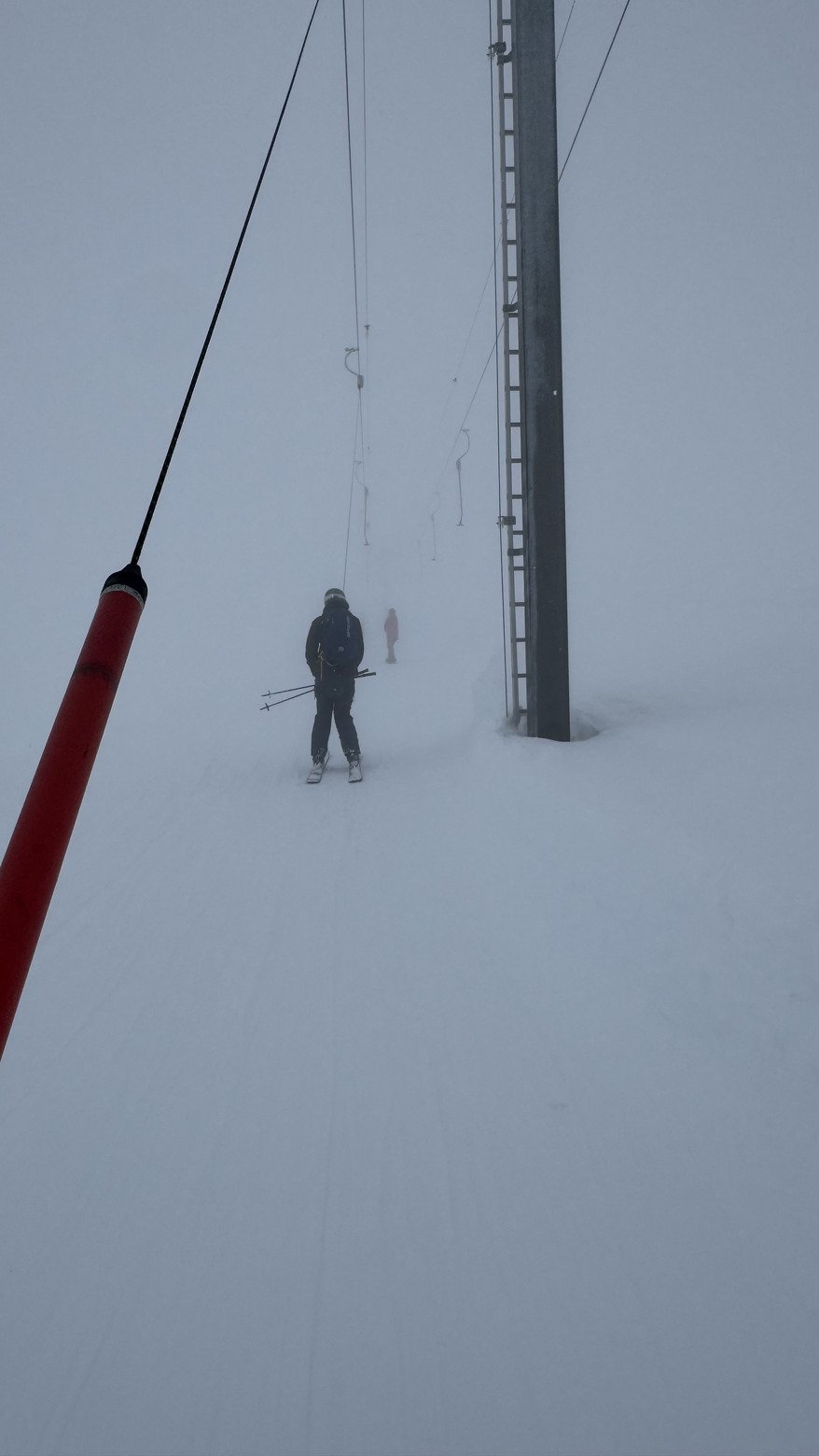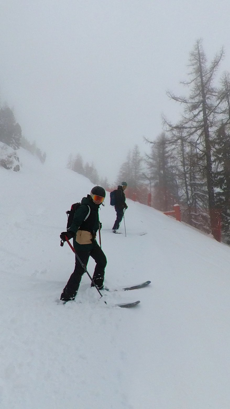 Venté et bouché côté tour, changement de décor sur Vallo. On voit rien mais la neige est bien meilleure. Un peu de peaux pour monter au sommet de la forêt et c’est partie !