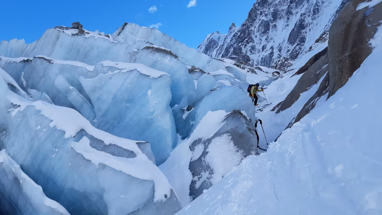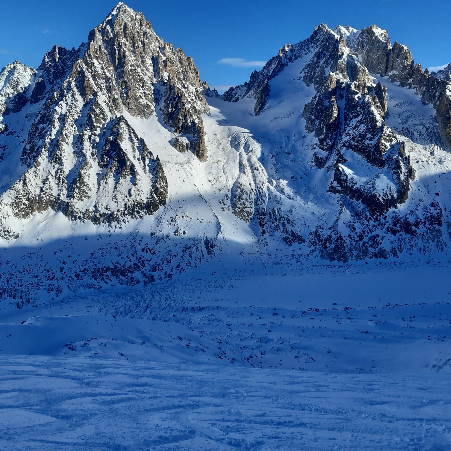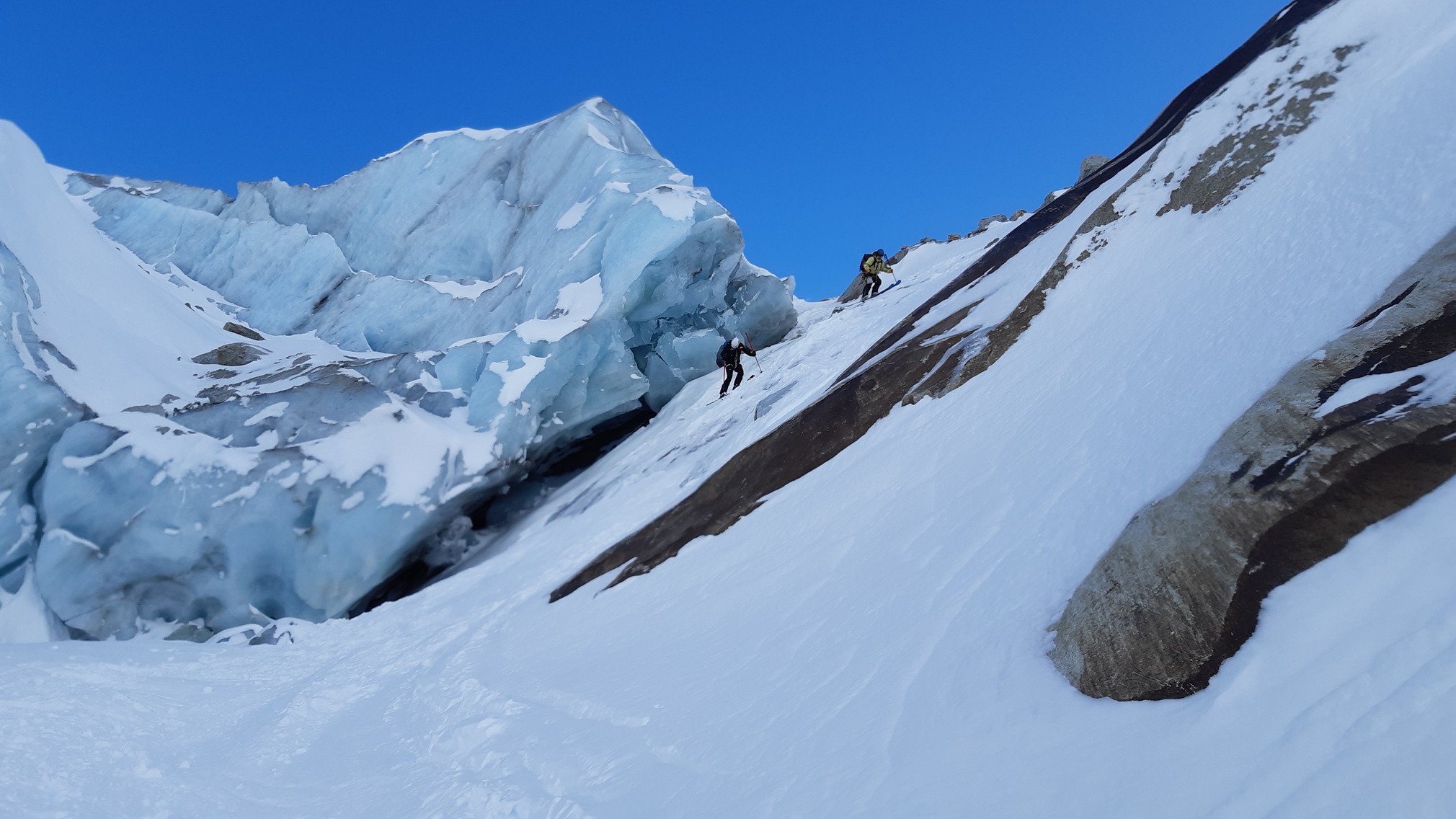 Ça passe très mal en bas le long du glacier pour l'instant (glace vive, cailloux), si j'y retourne et qu'il n'a pas neigé entre temps, je le ferai en crampons/piolet.Le glacier a vraiment pris cher : le schuss final est une succession de petites montées/ descentes avec quelques fossés créés par des crevasses bouchées à passer. Ça fait flipper.