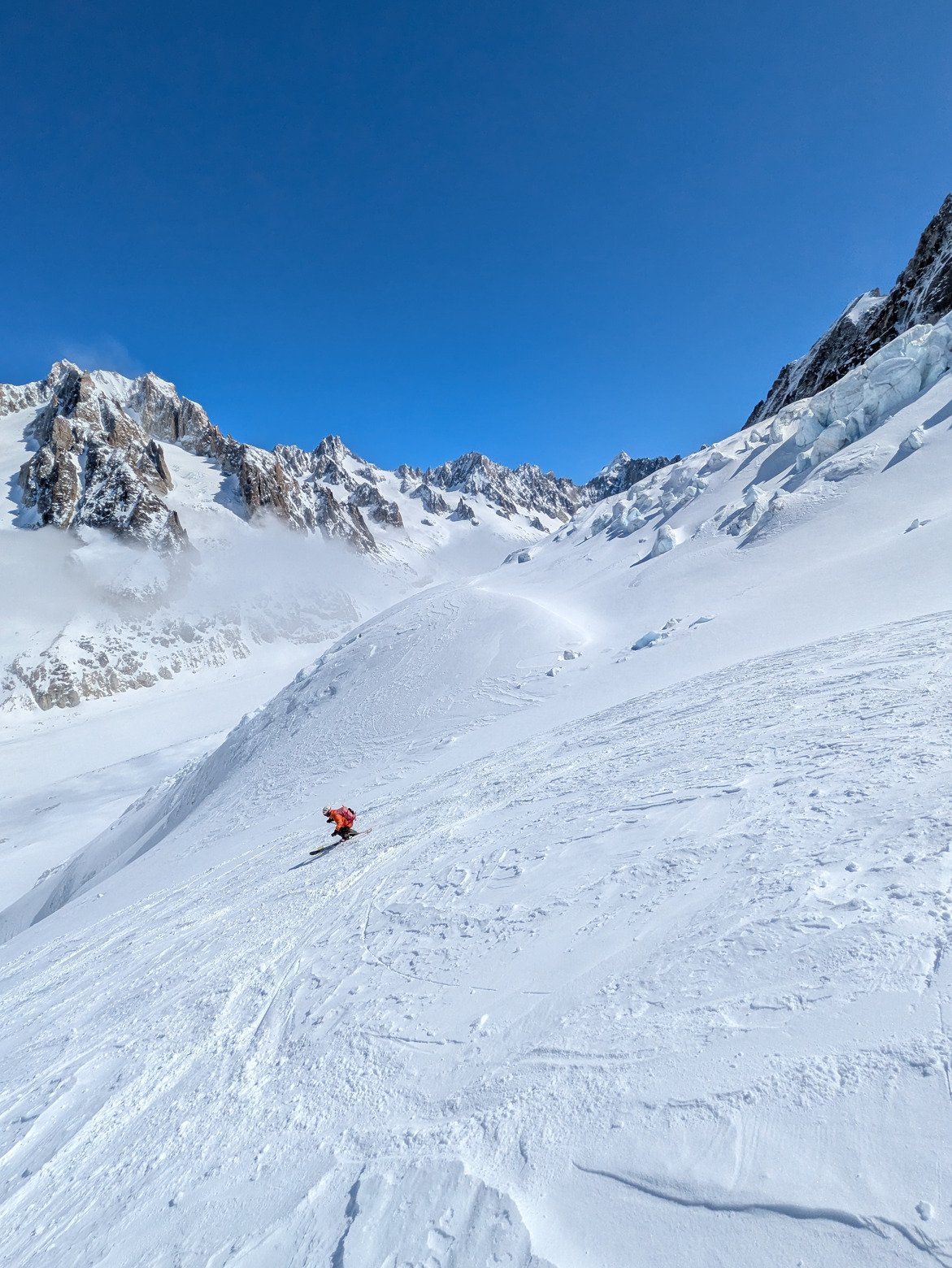 encore une belle journée aux grands aujourd'hui, mais je suis absolument bluffé par le changement de neige en moins de 24h aux mêmes endroits. La bise a été très active et les transports de neige sont importants. Les ouvertures sont retardées par ce vent très fort, d'ailleurs flégère n'ouvrira pas. Par moment même en se jettant dans la pente on fait du sur place, impressionnant.