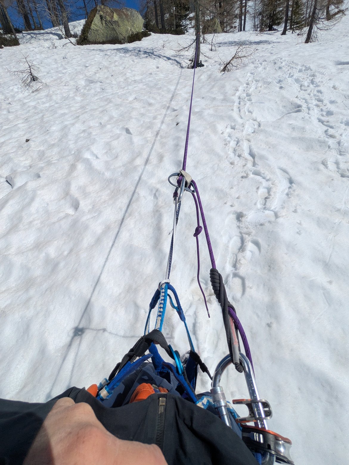 programme sensiblement le même qu'hier, ski de printemps aux grands dans une neige décaillée très bonne à skier. en hp la neige colle sous 2500. L'occasion de prendre un temps pour s'entrainer aux manips de corde sous le soleil!