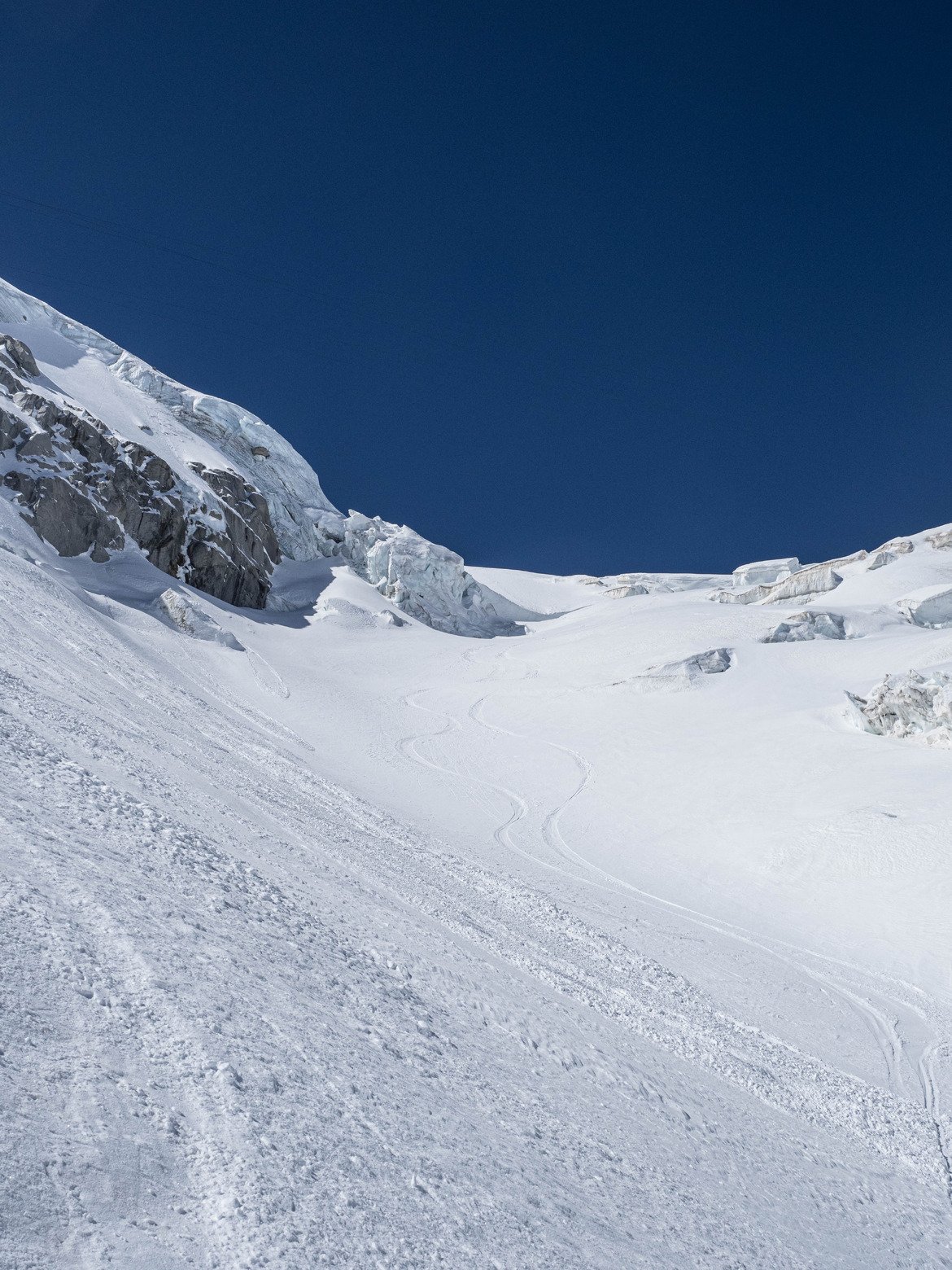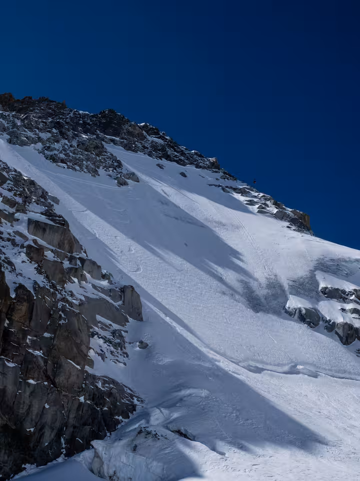 Mais on pimente un peu le truc en allant chercher en bonus une descente bien raide plein nord qui n'a pas été encore tracée, ambiance garantie. 50°, une face sans trace qui nous attend, la neige PARAIT excellente à skier. En réalité, sur le haut la glace n'est vraiment pas loin donc il faut être bien réveillé. Sur le bas c'est de la poudre donc on peut un peu plus lacher les watts. Rimaye bien bouchée, on récupère l'itinéraire de la vraie vallée blanche. Je rentre à la maison et check le topo, c'est du 5.3 e2 "sur le papier".