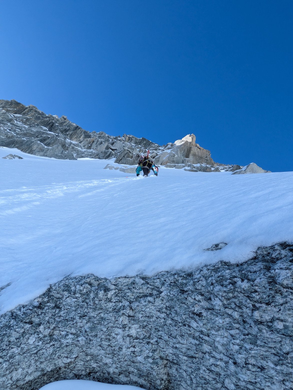 Après les 2 vallée blanche hier, petite volonté de changer d'itinéraire et d'aller faire le couloir des cosmiques puisque la veille les conditions étaient bonnes d'après plusieurs retours. On arrive dedans, ca a gelé pendant la nuit et la descente risque de ne pas être très sympa, pour ne pas dire inskiable (orienté Ouest).