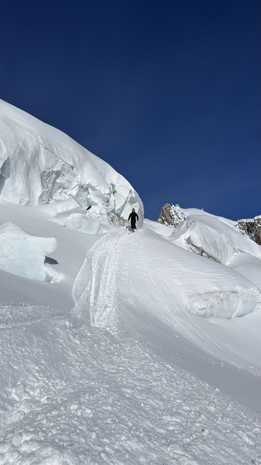 Des dépôts d’avalanches sur les deux côtés de la salle à manger, dont une grosse sur cette fin de vallée blanche qui est venu remplir le trou avant la traversée. Avec la couche qui est entrain de tomber à nouveau, les itinéraires seront encore plus fluides 👀