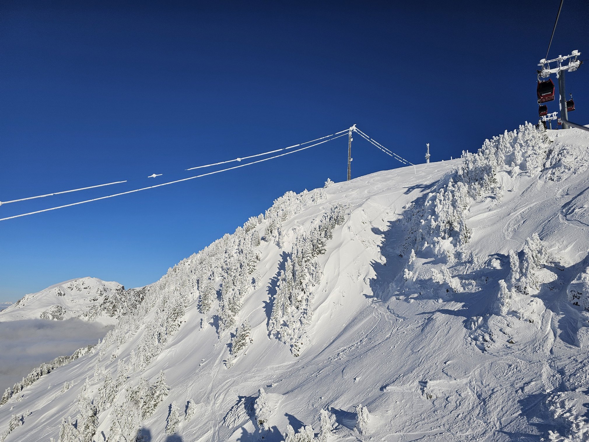 Le blizzard des derniers jours et le ciel bleu offre un panorama et des conditions d’enneigement exceptionnelles pour cette fin novembre. Dès la montée en télécabine, la vue donne le ton : c’est de la folie !