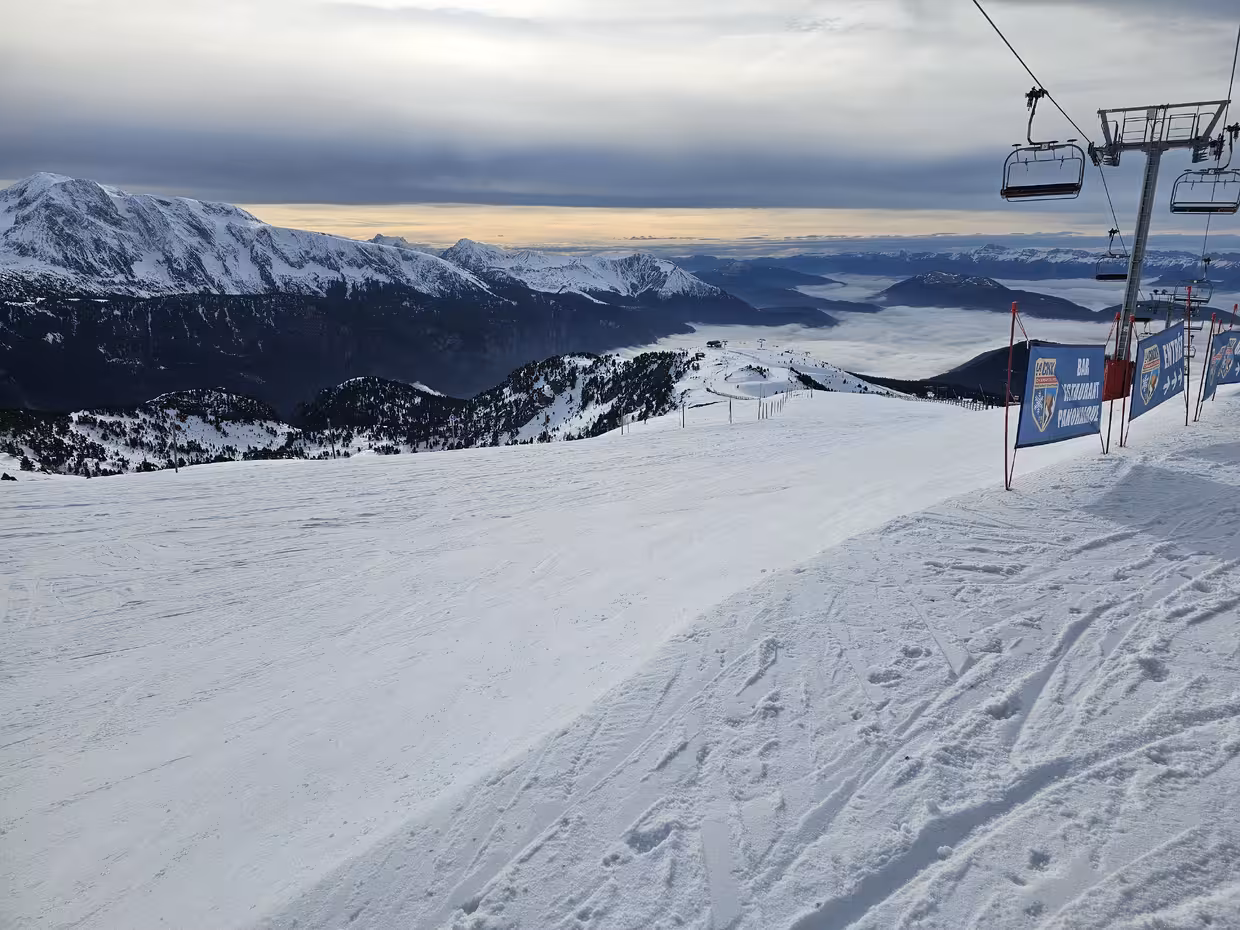 Aujourd’hui, deux couches de nuages, une en haute altitude et une mer de nuages sur Grenoble (une pensée pour ceux en-dessous, ça devait être la nuit avant l’heure…). Bon, pas de ciel bleu, mais des lumières parfois orangées, ça change + pas de vent. Il fait pas froid et la neige est correct avec parfois du dur.