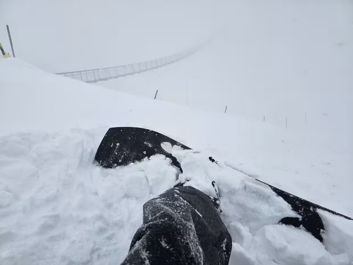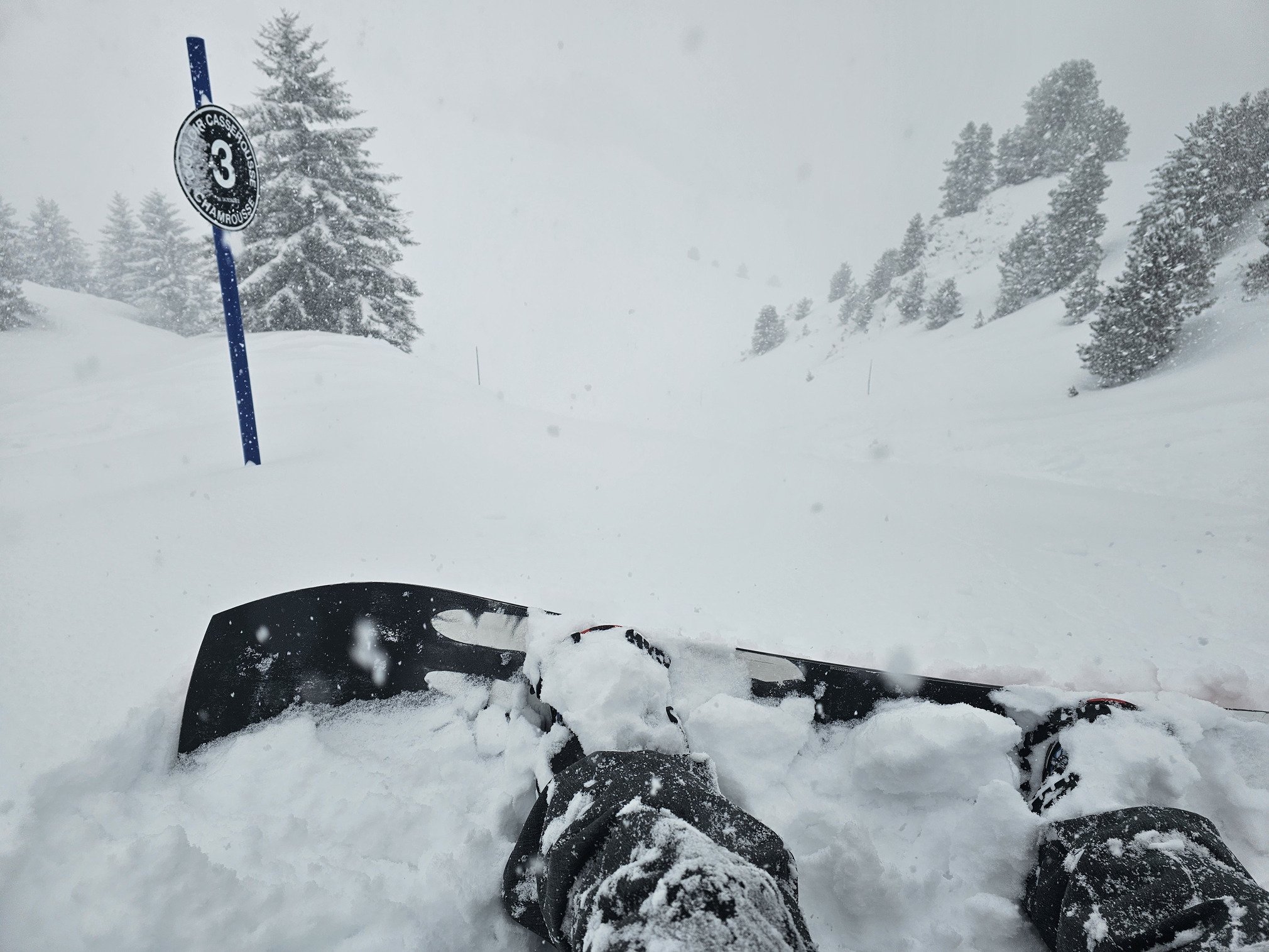 Matin : Après quelques descentes sur le secteur de Roche, je décide d’aller à la Croix à 2250 mètres d’altitude. Roche est un secteur « ski dans les sapins », du coup, peu de brouillard et une visibilité correcte. Bin à la Croix, on peut pas en dire autant. Là-haut, je marche avec mon snow pour me rapprocher du couloir de Casserousse. Il y a tellement de neige fraîche que le petit plat du sommet est impossible en snowboard. On voit un peu la passerelle du Panoramic Park, c’est parti pour 850 mètres de dénivelé de folie. Peu de monde est passé. C’est une belle descente grosse fraîche jusqu’au télésiège de Casserousse à Chamrousse 1400. On est vite dans les arbres (comme souvent à Chamrousse) et du coup, bonne visibilité. Je suis resté toute la journée avec un masque écran 1-3 (et n’ai pas utilisé mon écran brouillard, pour les jours blancs, indice 1). Je profite du secteur car c’est le dernier jour de la saison pour ce télésiège. On est fin mars, et c’est vrai que les conditions d’enneigement font penser à un plein hiver. Neige : grosse fraîche jusqu’à mi tibia avec une base neige dure. Donc ça reste un peu technique. Le matin, je reste sur le secteur d’autant plus que le snowpark est fermé.