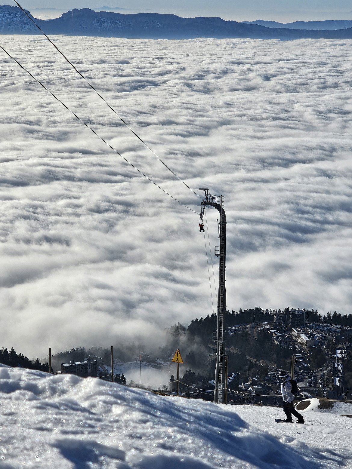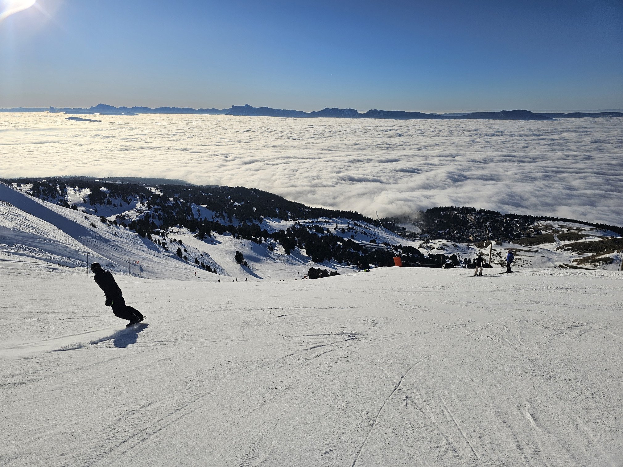 Finalement, il n’y a pas foule sur les pistes, les gens doivent surement se préparer pour ce soir. Aujourd’hui, c’est magnifique mer de nuage (bien épaisse, limite il fait nuit à Grenoble, courage pour les gens ici-bas…). La neige est bien là, mais avec quelques plaques dures. Bref, c’est blanc et ciel bleu mais il faut rester vigilant, privilégier le ski balade dans les sapins et bien maitriser sa vitesse.