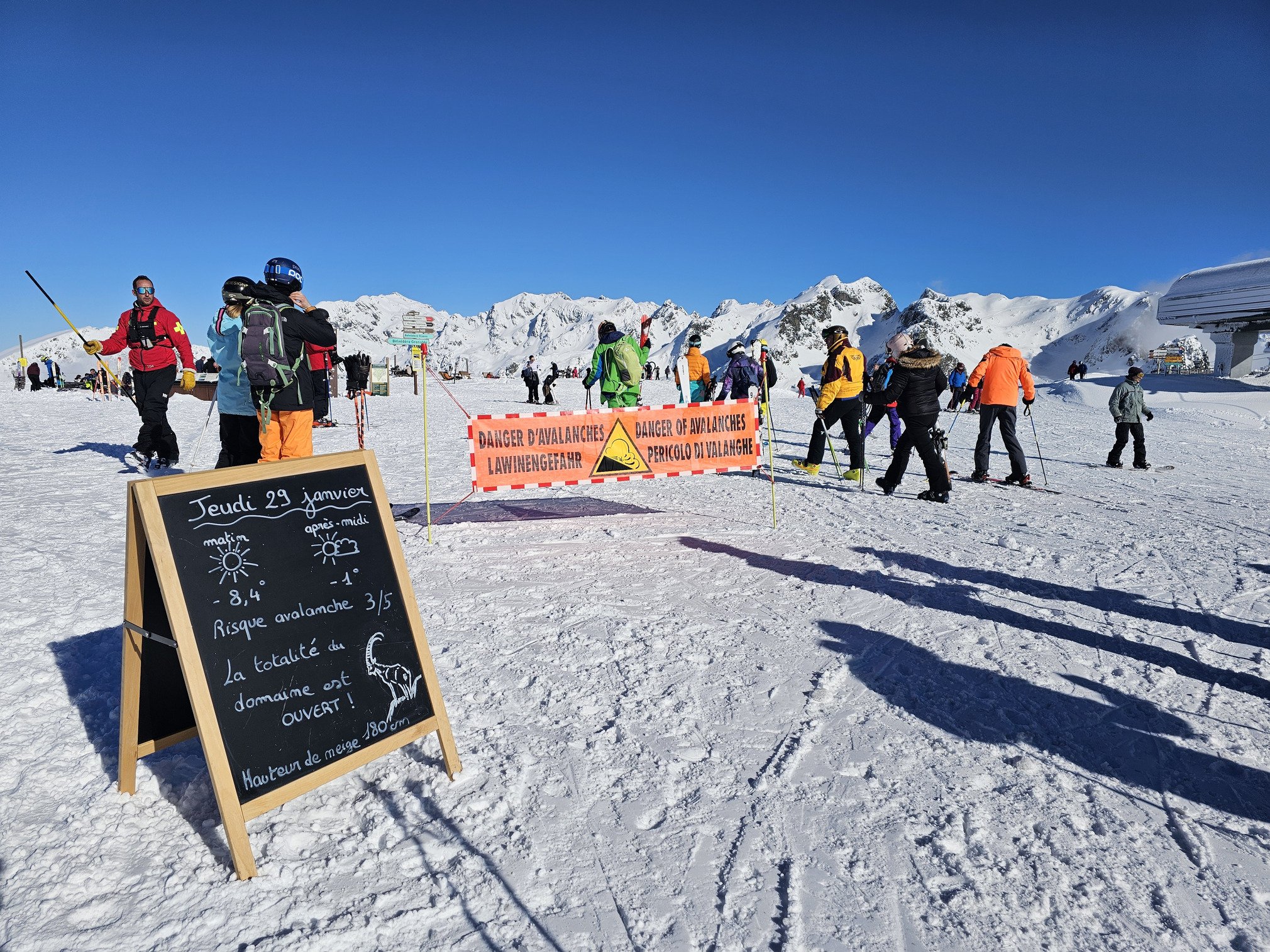 Il a neigé 48 centimètres ces 2 derniers jours, du coup, c’est des conditions parfaites pour tout le monde : il y a de la belle piste damée… et des zones de fraîche technique avec des traces partout. Les bords de pistes sont top et agréables. Attention, au niveau hors-piste, c’est quand même bien avalancheux (indice 3/5).