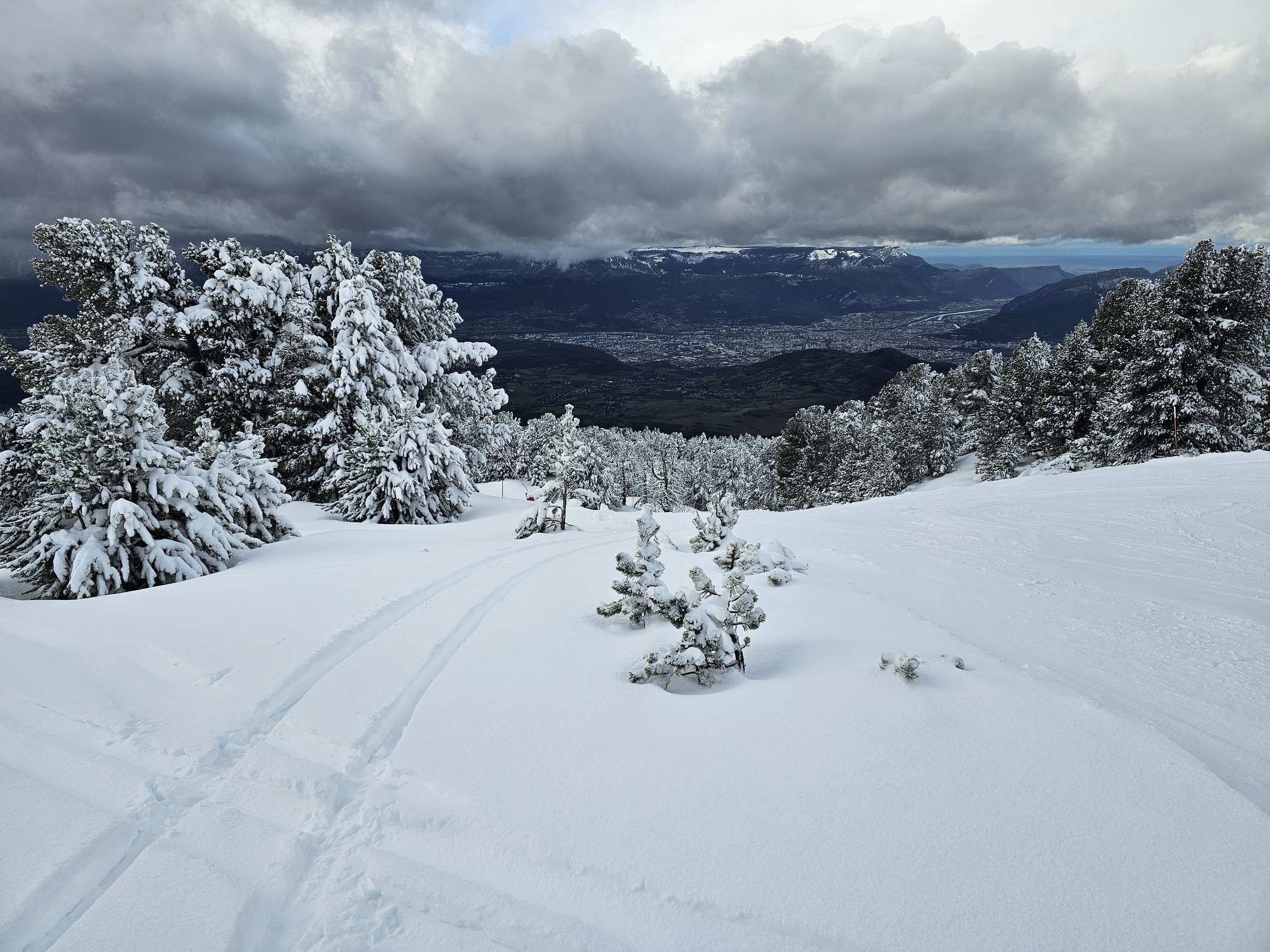 On reprend la télécabine. Une fois au sommet, on prend les Crêtes direction la Montagne de Téo. De nouveau visibilité réduite mais avec un gros vent en plus. Bref, c’est un moment où on se dit « c’est peut-être la descente de trop ». Je persiste, on ne prend pas Bascule, direction secteur de Roche Béranger. Le vent disparaît, la visibilité s’améliore. Une fois à la Montagne de Téo, c’est le smile, ça se dégage fort, le ciel bleu apparait au milieu des nuages. La zone hamac géants et la peuf légère invite à la déconnade. Puis direction le TSD Ecrins. On rentre par le Schuss des Dames en mode peuf et vue sur Grenoble. C’est top bien, mais il faut rentrer au bureau ☹…