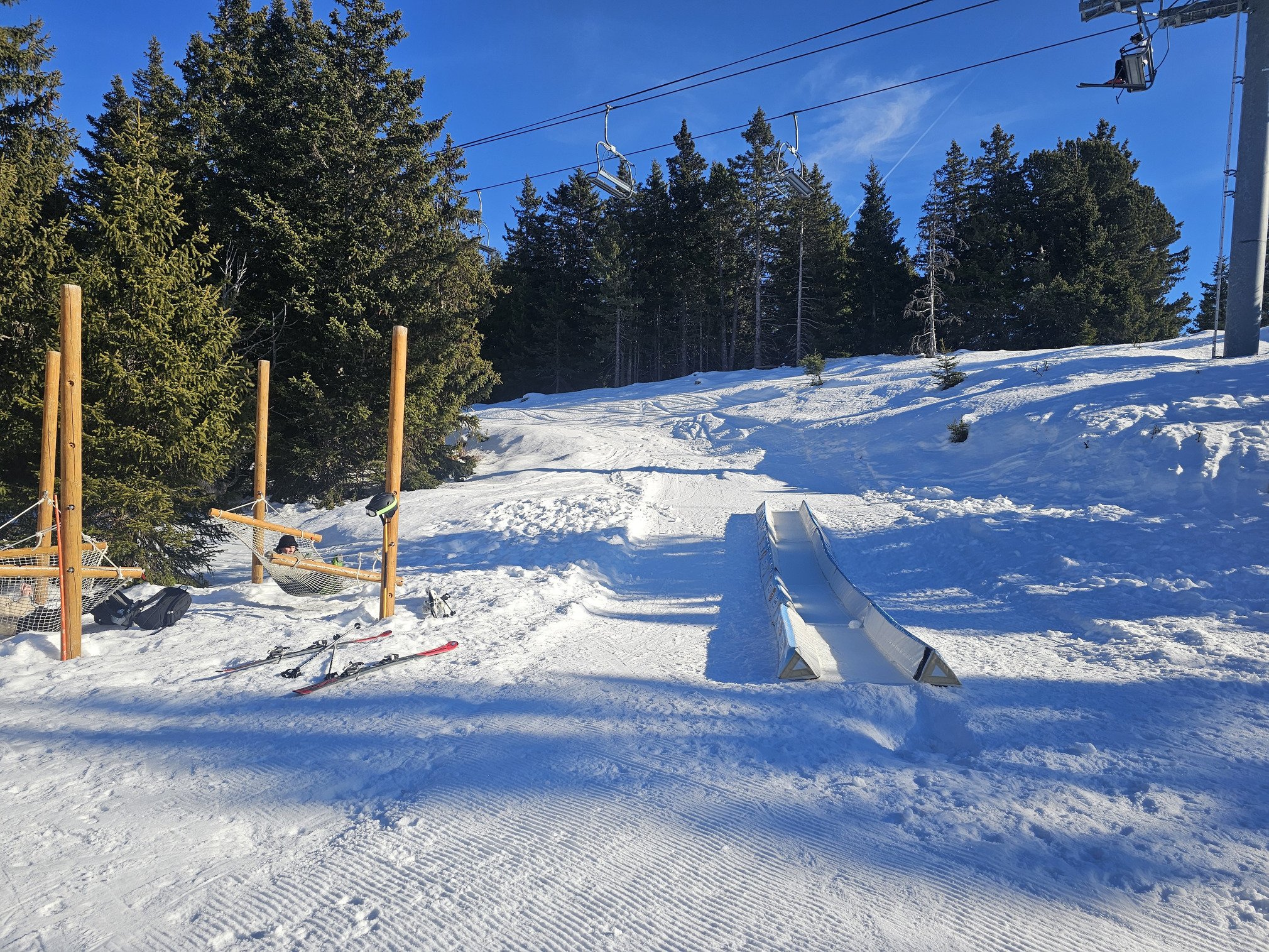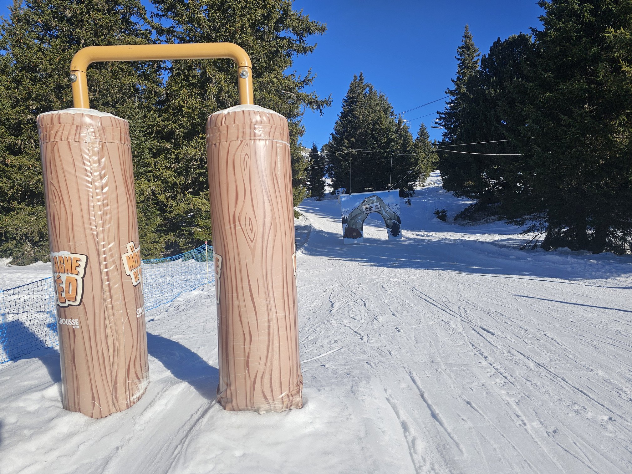 Une fois arrivé à la Montagne, je prends quelques photos. Il y a tout dont les 3 hamacs géants, le toboggan et la toute nouvelle cabine « L’étape » (pour manger à l’abri). Des jeux sont aussi disponibles sur la piste de Eterlou ; franchement, on a une belle proposition famille ici.
