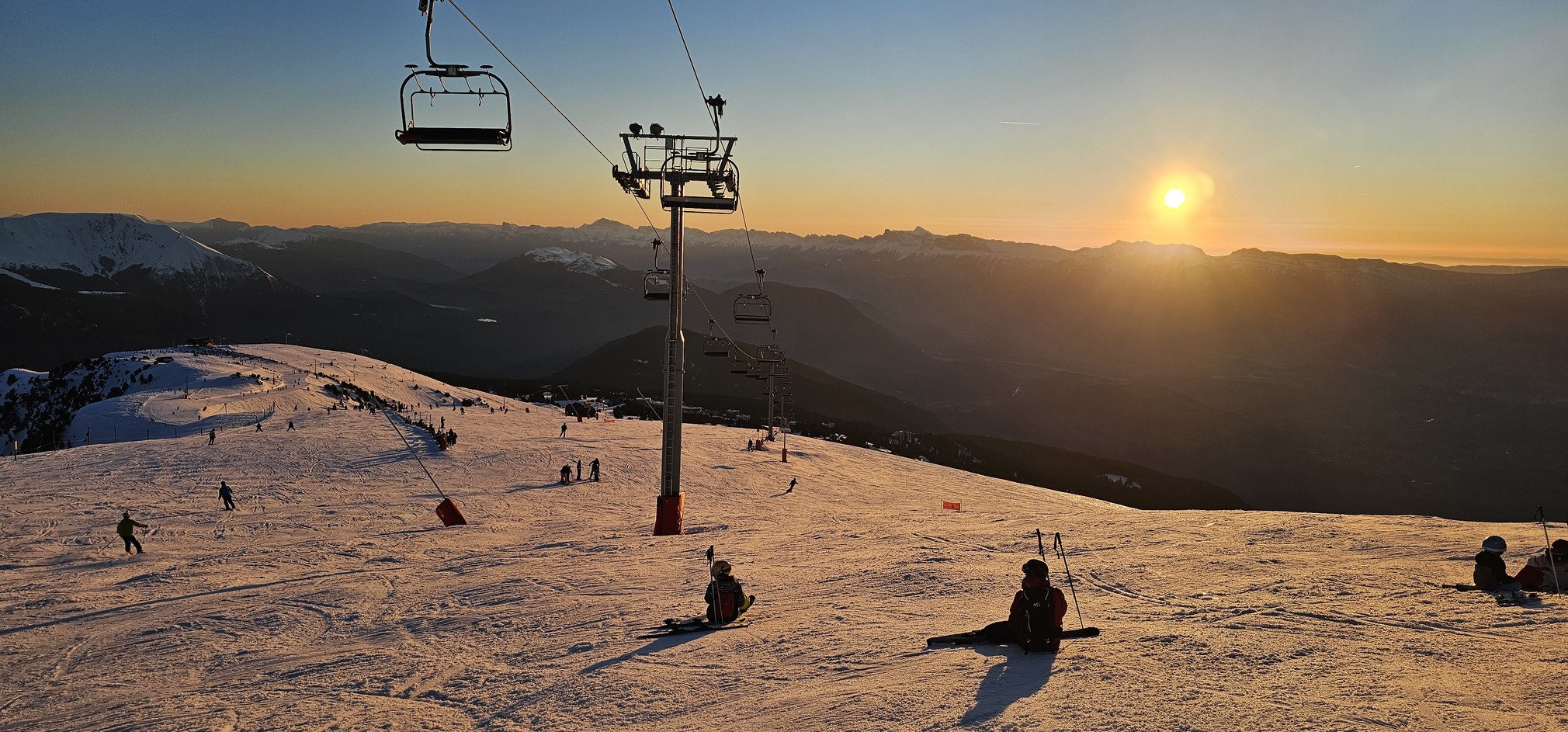 Sortie 2 : les jeudis des vacances, c’est nocturne à Chamrousse jusqu’à 19h30. On fait une petite séance shooting avec une collègue. Je décide de prendre la télécabine à 17h45 (avec un blouson en plus cette fois et un écran indice 1 pour mon masque dans le sac). Wow, y’a plein de monde, je fais la queue. Heureusement, ça va vite et je rejoins la team animation (les DJs Rilou) et leur petite musique d’ambiance pour le coucher du soleil au sommet de la Bérangère. Y’a du monde et le spectacle du coucher est là. On fera ensuite une montée via le TSD Bérangère et une montée via la télécabine. En nocturne, la neige se transforme, c’est une glisse différente. La contemplation est là. On finira vers 20h00. J’aime les nocturnes avec la vue sur Grenoble comme ça.