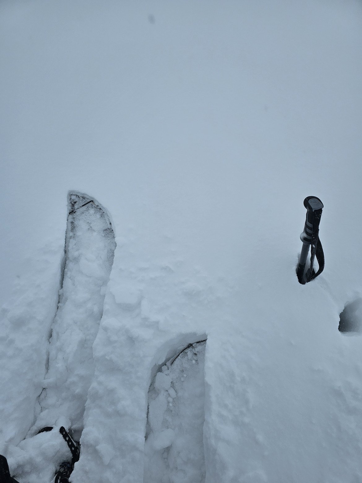 Et là, très vite je commence à regretter mon choix d’avoir pris le split. Il est flex, mais il y a tellement de fraîche que la descente devient très technique. Je garde les bâtons. J’ai parfois du mal à identifier les zones avec de la neige un peu plus dure et les zones où on s’enfonce sévère dedans. Je me prends plusieurs murs de neige (qui donnent un mixe d’impressions entre rigolo, sourire et « ça commence à bien faire »). Plusieurs fois, je me retrouve à l’arrêt à cause de la neige au-dessus du genou. A un moment, sur Bascule, je me retrouve bloqué avec de la neige au-dessus du bassin. Je déchausse et décide de descendre à pied une partie des Gaboureaux. Je croise 2 skieurs de rando, l’un me demande inquiet « ça touche ? », j’ai failli exploser de rire. Je lui explique que c’est plutôt l’inverse.
