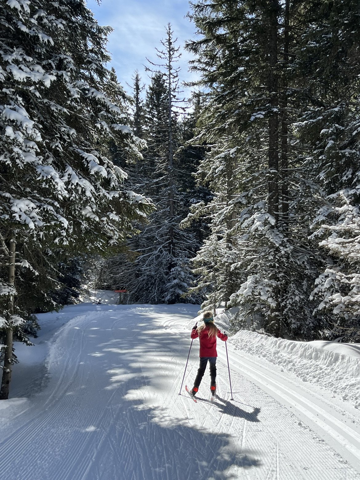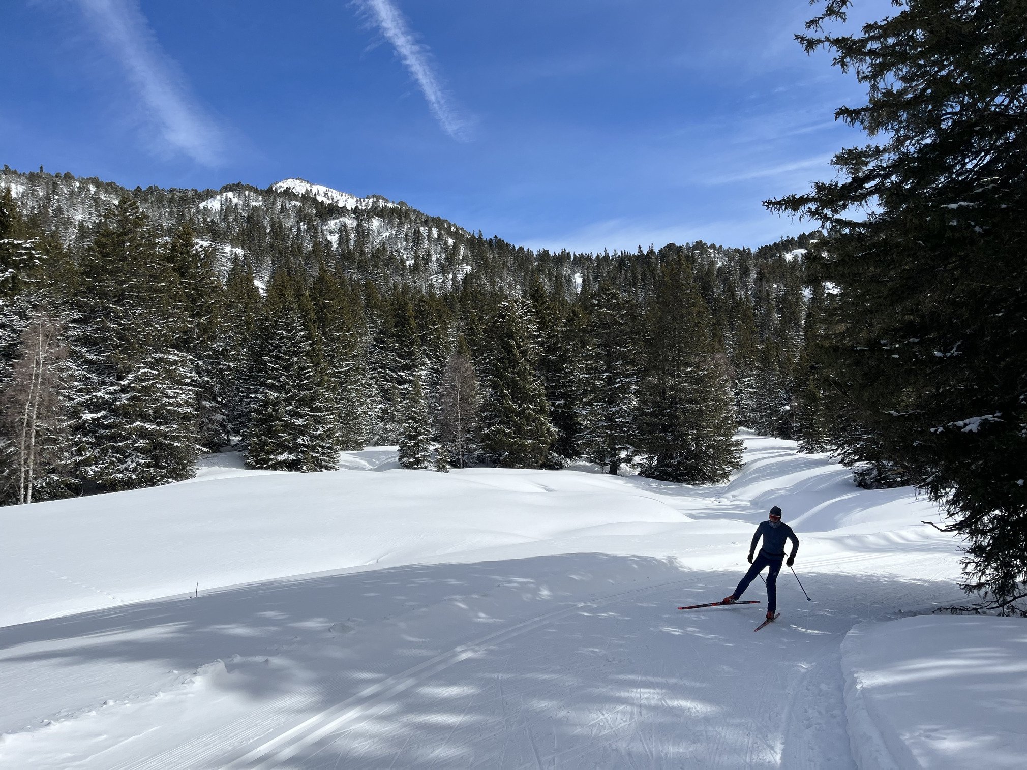 Une journée digne du cœur de l’hiver avec tous les éléments de la carte postale montagnarde : quantités de neige phénoménales pour la saison, de la neige fraîche sur les arbres, un grand soleil, une neige froide avec un damage et une glisse aux petits oignons… juste le vent qui souffle un peu fort… mais en restant sur les pistes en forêt (Lièvre en bas, et Astragale haute ensuite) on était parfaitement protégé.