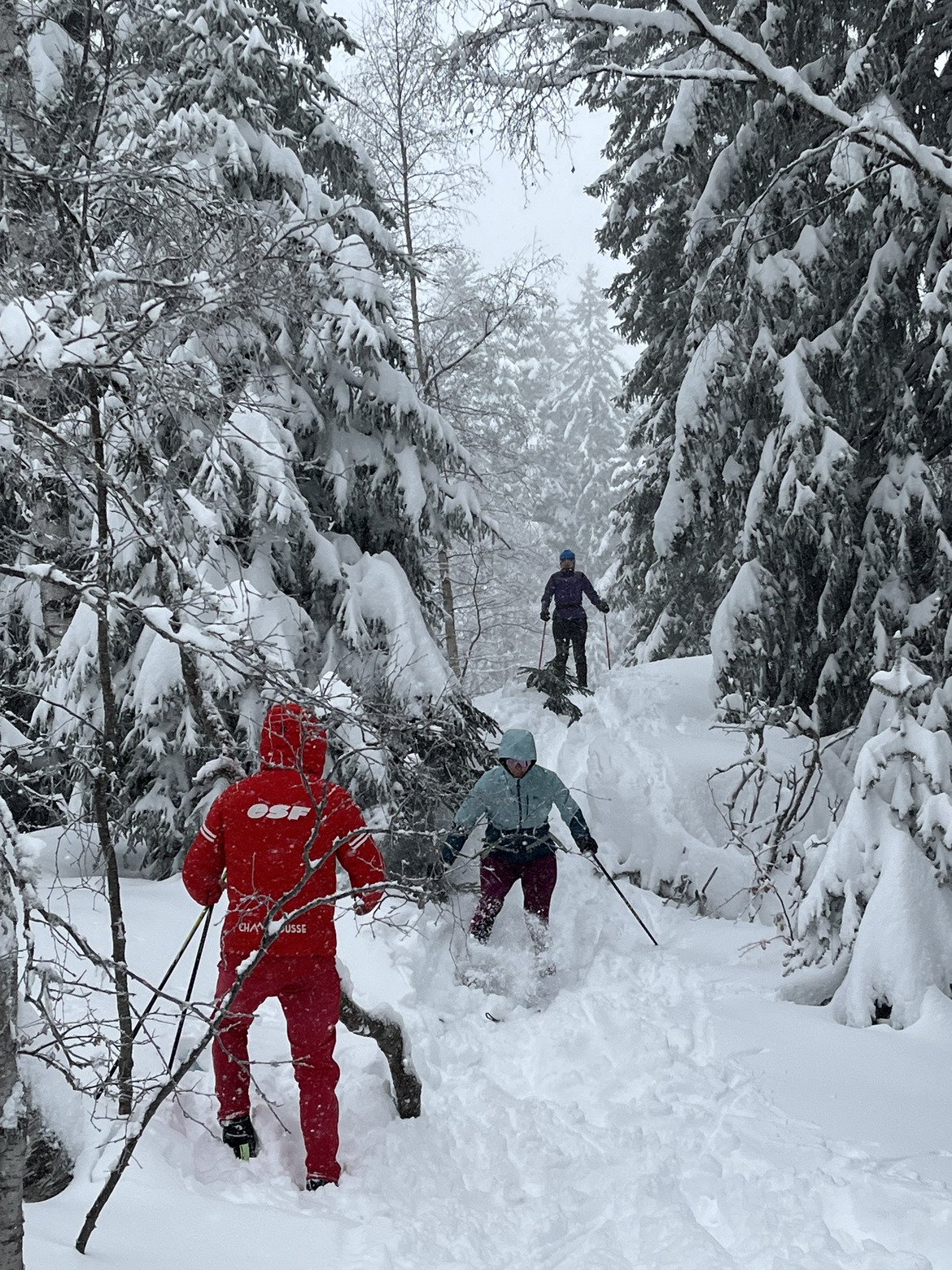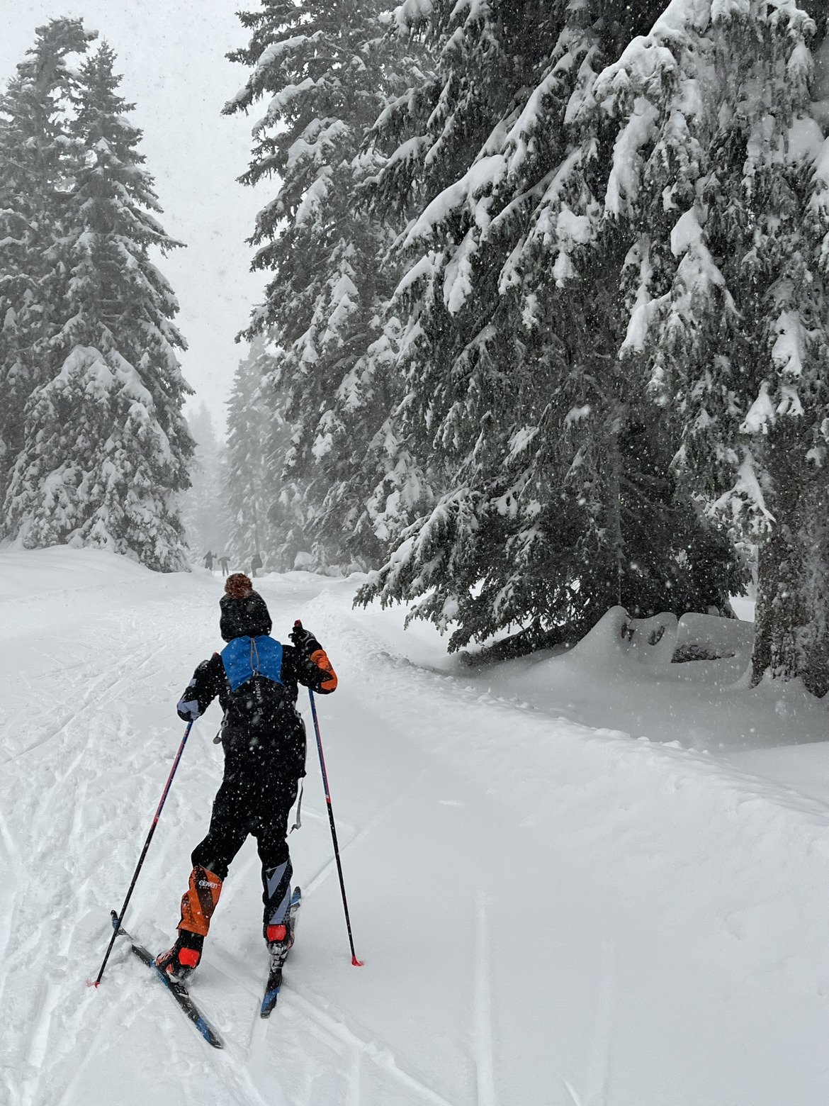 Les pistes sont couvertes de 20 de poudreuse, il faut lever les pieds et ne pas trop appuyer sur les bĂątons pour avancer⊠bref câest pas la sortie de fou qui permet dâenchaĂźner les kilomĂštres mais lâambiance valait le coup !