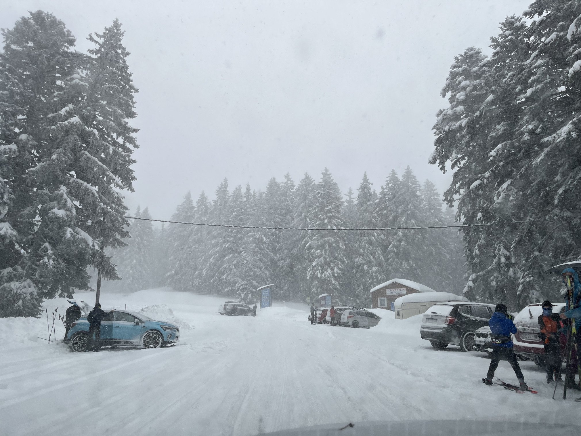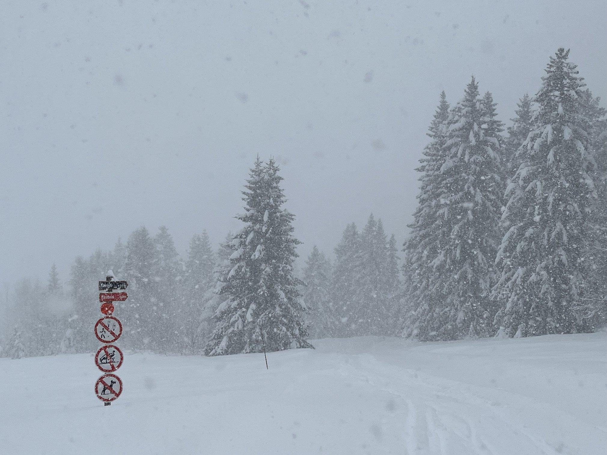 Alternance de moment calmes puis de tombĂ©es de gros flocons. Pas trop de vent sur la partie basse / dans la forĂȘt. Ăa caille beaucoup plus sur la partie haute / les descentes de retour.