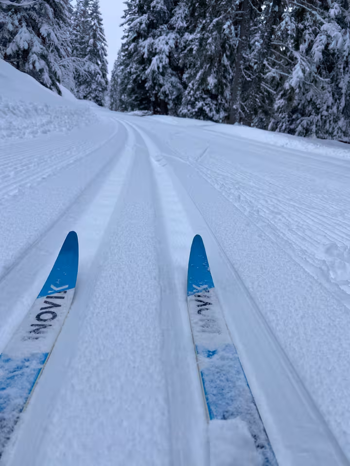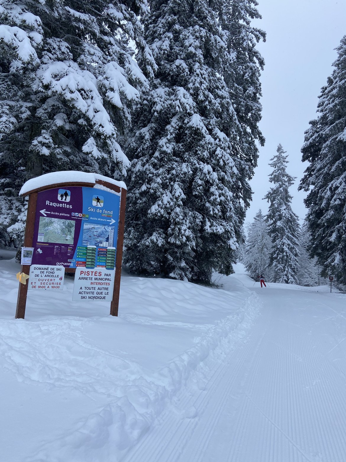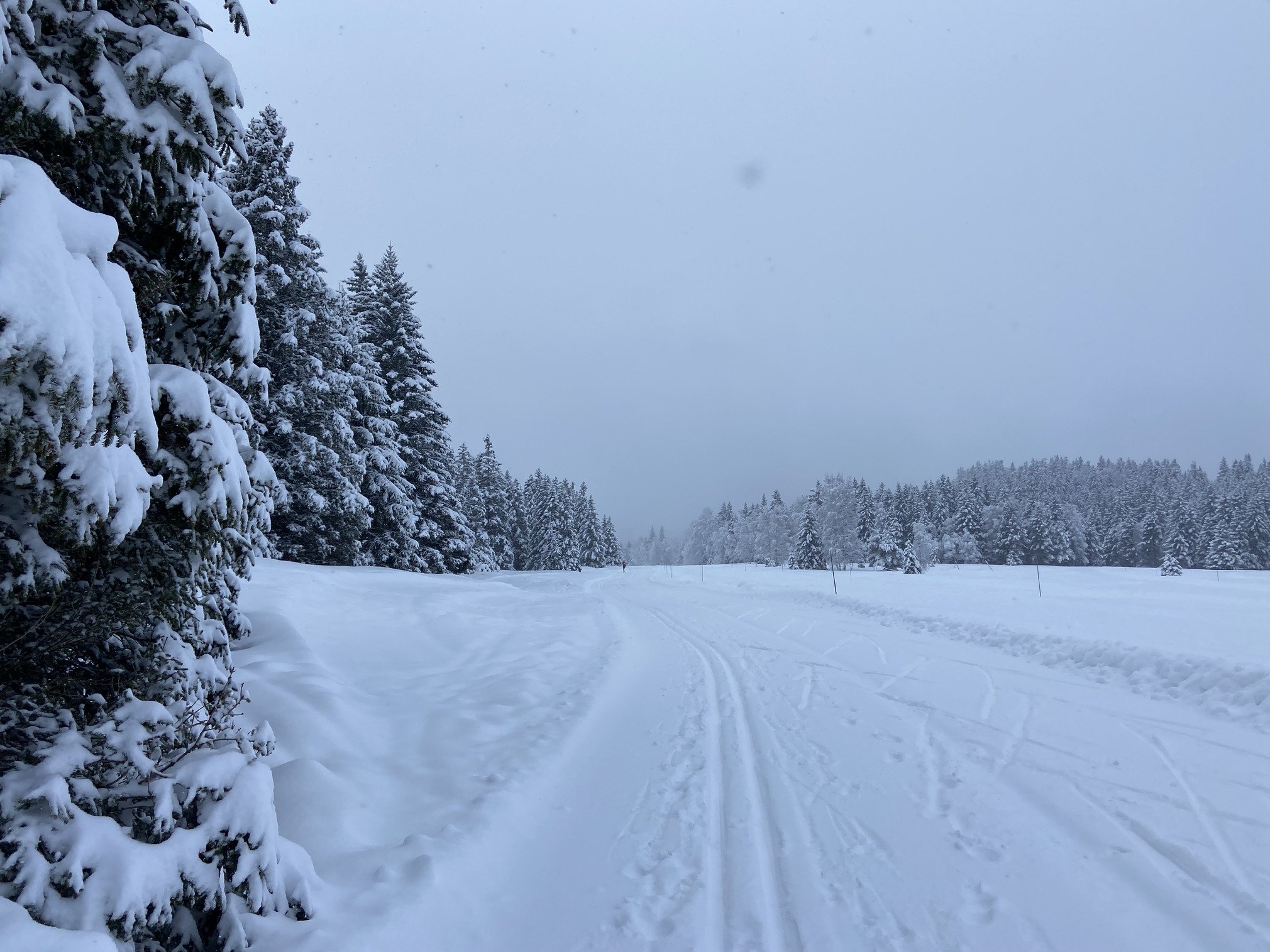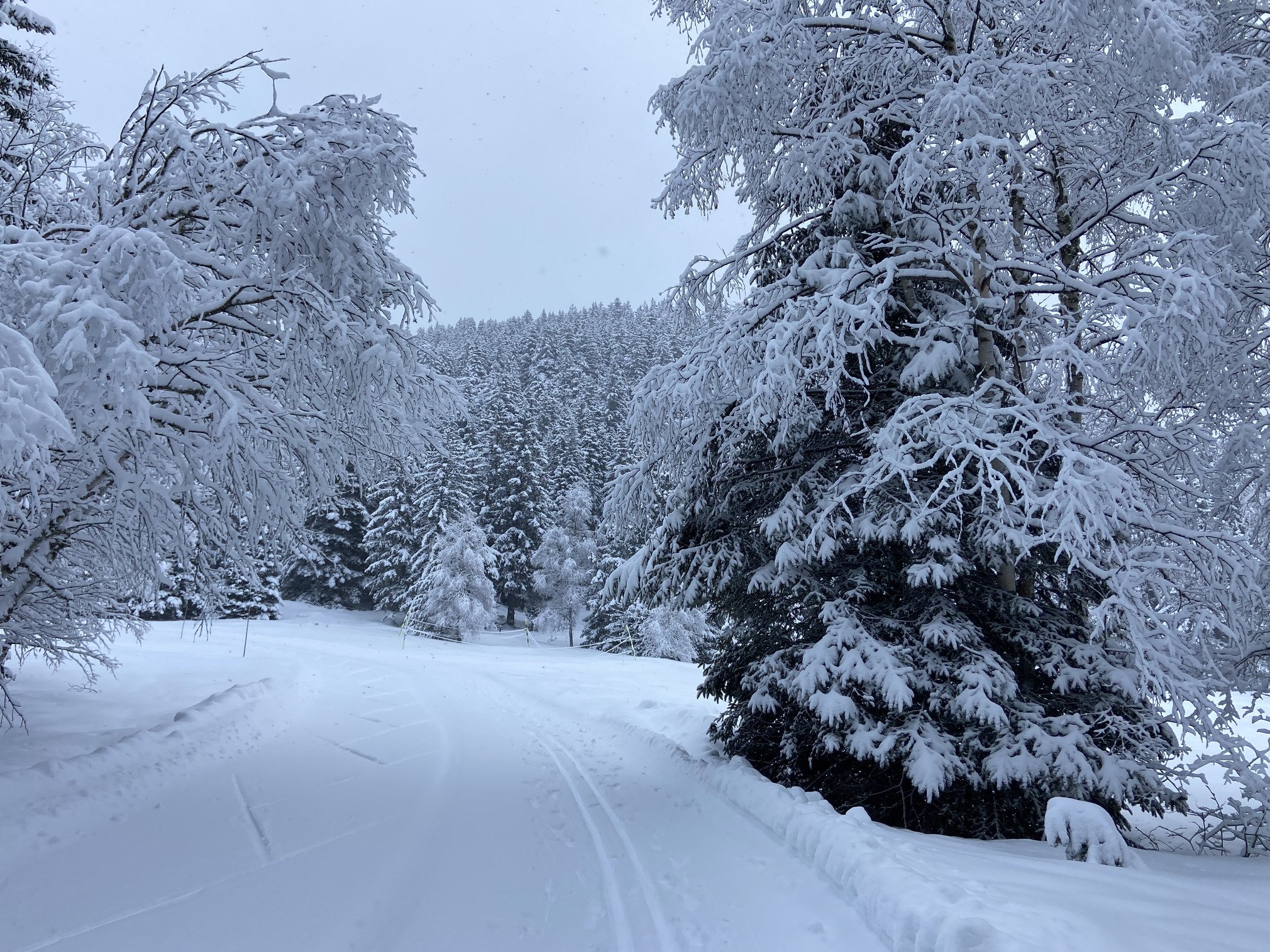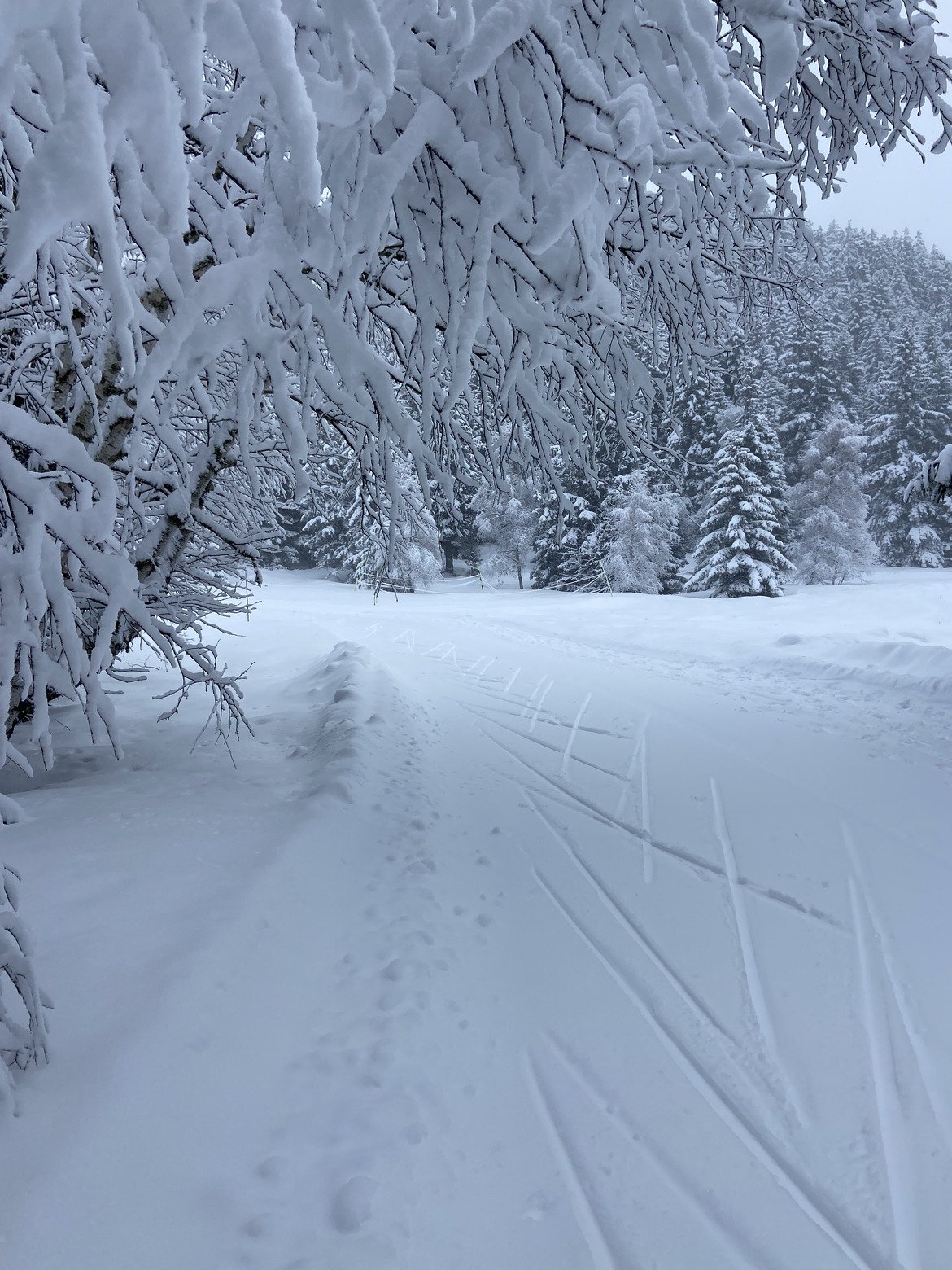 On a commencé par la piste bleue Salinière, sympa pour le cadre mais pas mal d’accumulation de neige sous les skis à plusieurs reprises qu’il a fallu gratter régulièrement pour arriver à avancer. Ca accrochait bien (parfois trop 😅) dans les rails. L’environnement était juste wouah, avec les arbres habillés de neige, du blanc à perte de vue et quelques flocons par moment. Au 2ème tour la neige s’accumulait moins sous les skis, la glisse était plus agréable pour le coup.