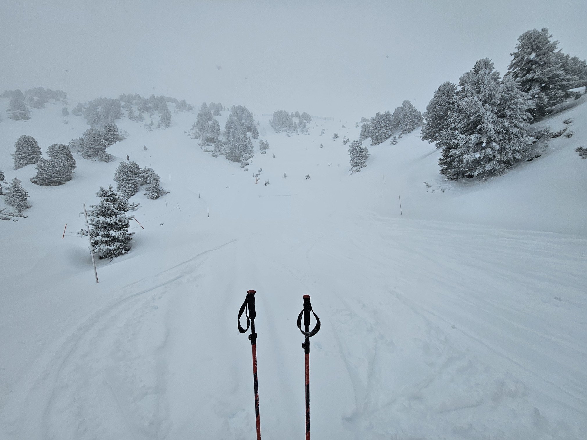 Finalement, c’est à Casserousse que la neige et (surtout) la visibilité sont les meilleures. On enchaîne plusieurs descentes, sans s’aventurer hors-piste ; il n’y a pas encore assez de neige. Mais qu’importe, ça tombe, ça tombe, ça tombe…