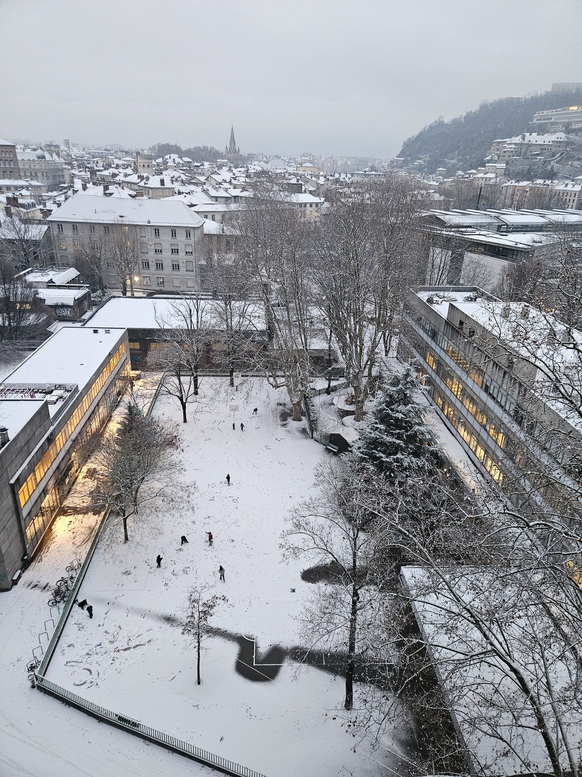 Et ce matin, en ouvrant les volets, je vois direct la cour de récréation de l'école de ma fille recouverte de neige. Blanche ! En l’emmenant à l’école, elle me dit : « Écoute ! Ça craque sous mes pieds ! » Eh oui, c’est bon signe.