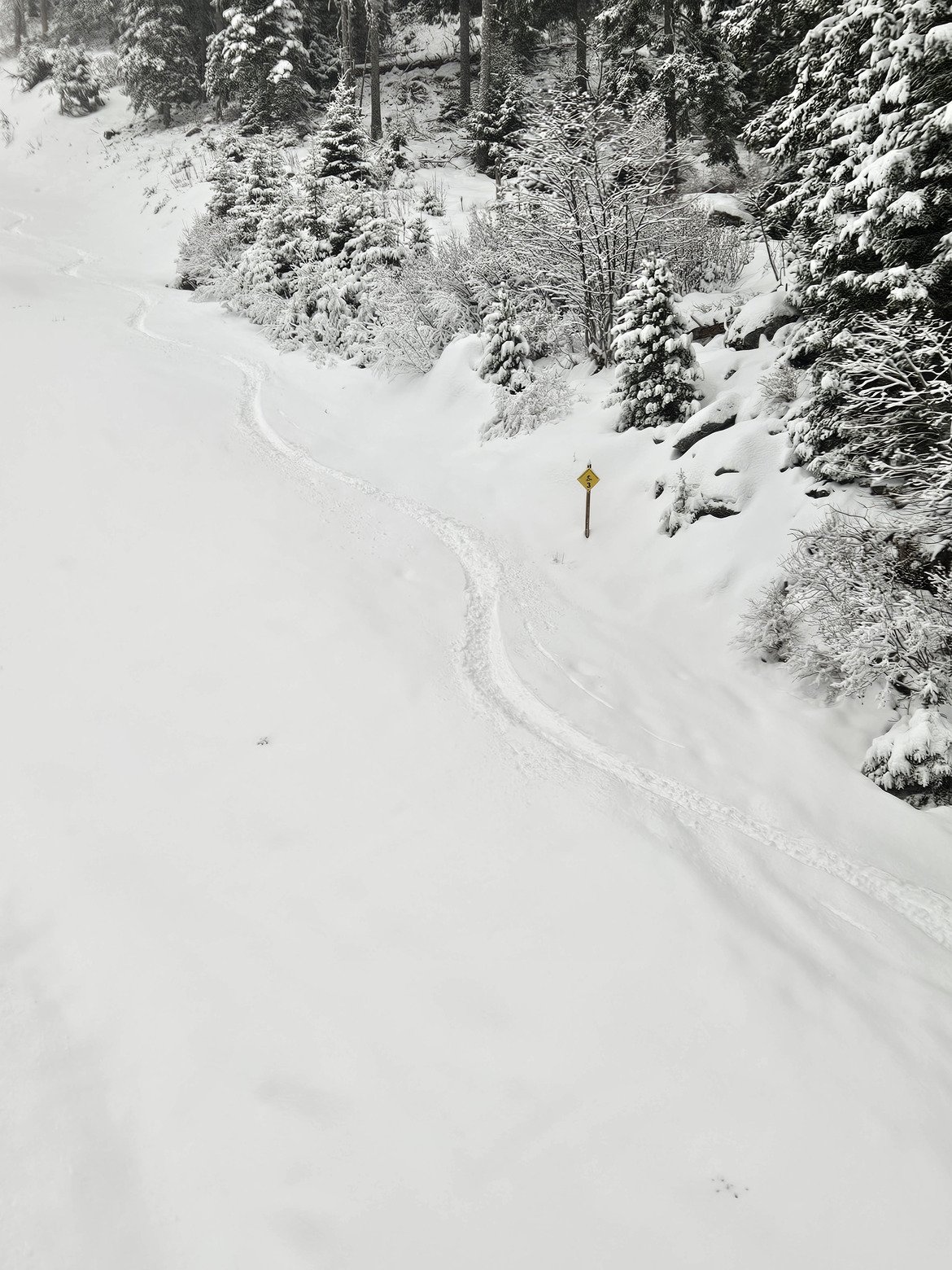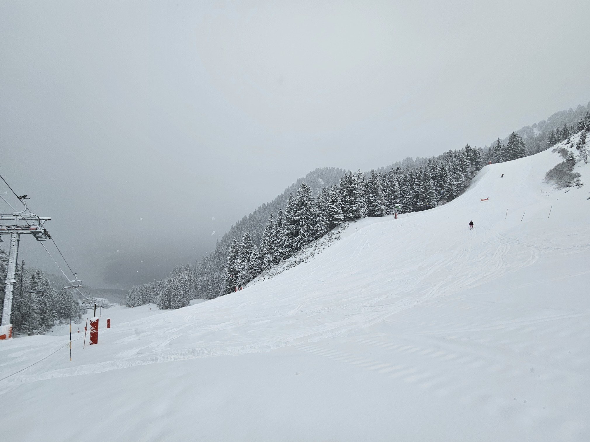 Et comme les pistes ne sont pas encore damées, on profite de la première couche tombée entre cette nuit et ce matin. Il y en a ! Le fond dur n’est pas loin, mais quel régal !