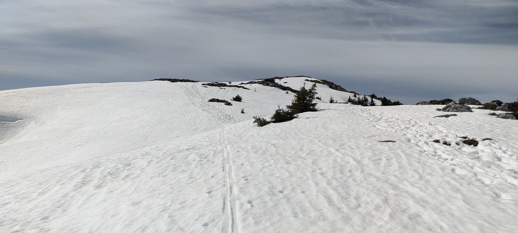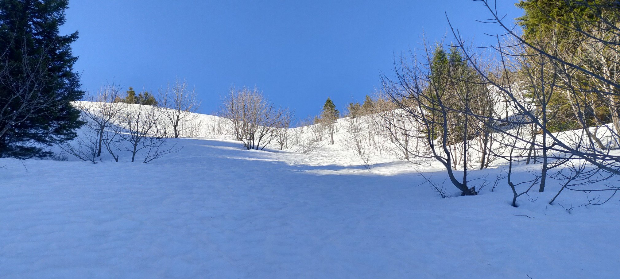 Je pique nique juste après pour laisser la pente exposée Ouest, qui domine le col de Bovinant, ramollir encore un peu. Bon choix, c'est quasiment en moquette vers 12h15. Pas parfaite car il y a des "vagues" plus grosses et aussi toutes les traces des piétons/raquettes, mais ça reste souple et bon à skier.