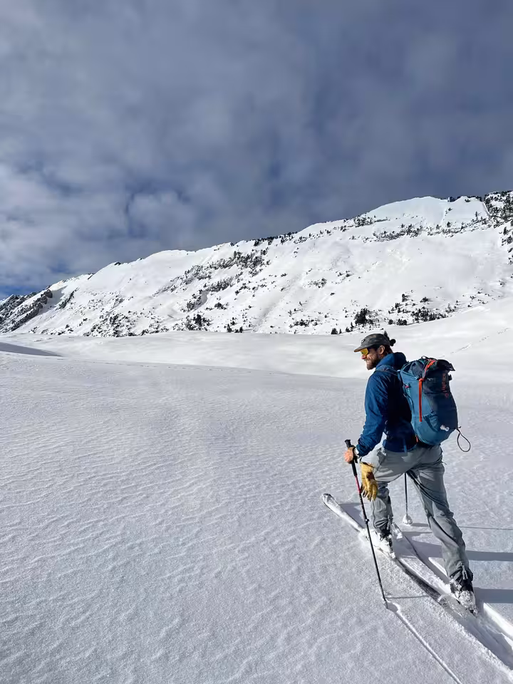 On depeaute et on file dans le Vallon. La face Nord du Dôme de Bellefont nous fait 100% de l'oeil. On se remet en route pour passer le col. Top pioche, meilleure descente de la journée de loin : 6/5.